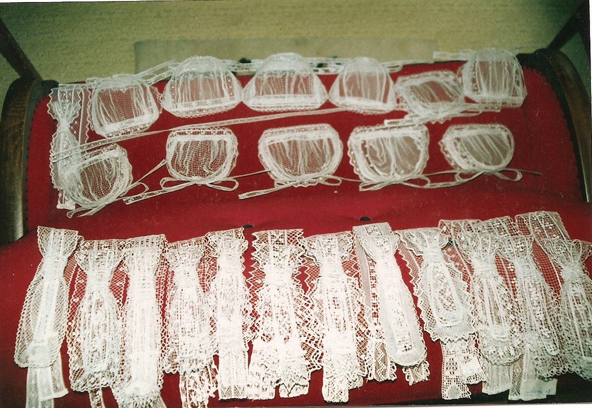Collectage réalisé à Ploeuc-sur-Lié dans les années 1980 (Photographie transmise par Frédéric Raffray) Toutes les coiffes ici ont un fond en tulle. Bavolet, visagière, mentonniéres, lacet pour cocarde sont en filetImmatriculation