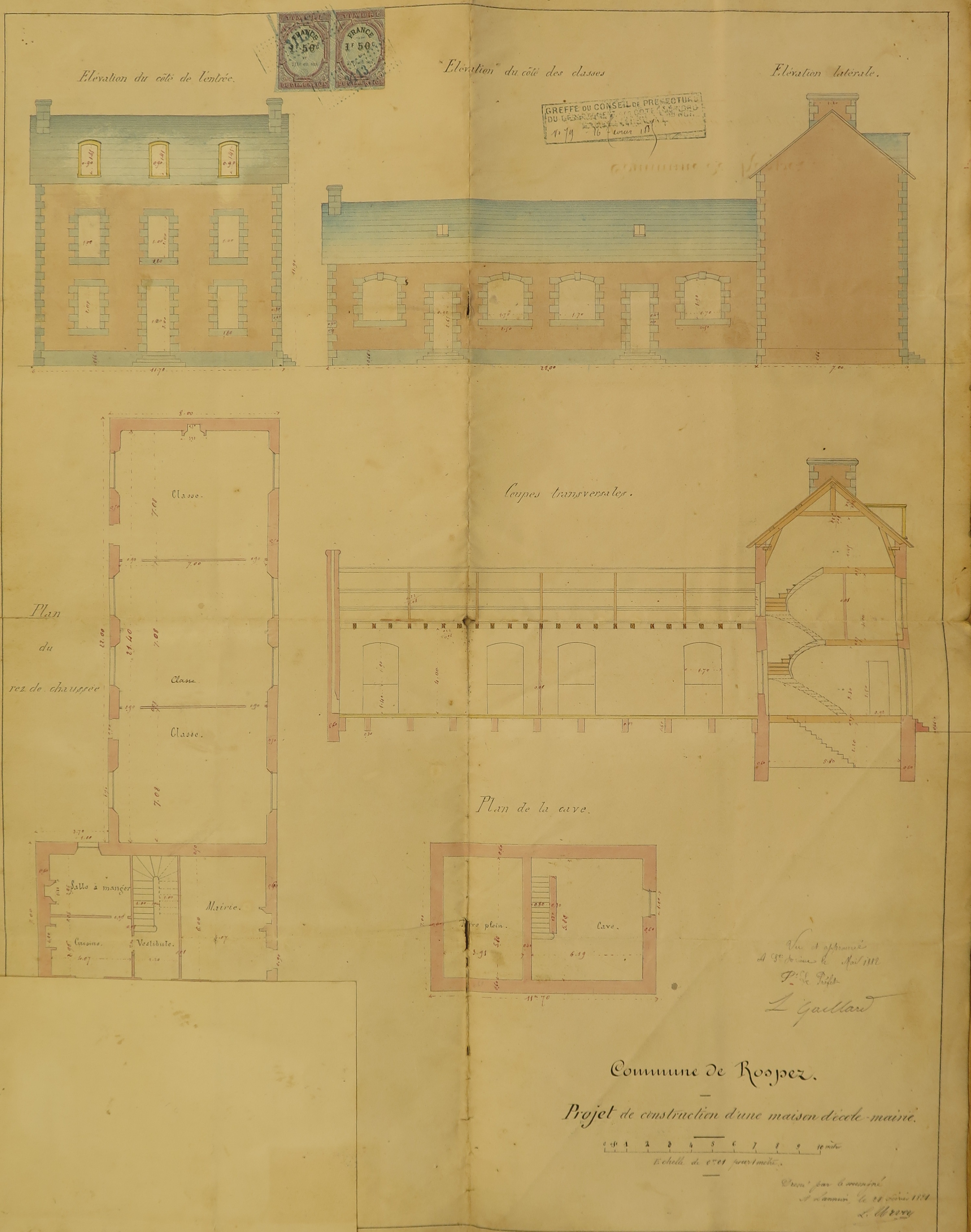 Rospez : plans, élévations et coupe du projet de mairie-école dessiné par l'architecte L. Urvoy (source : Archives départementales des Côtes d'Armor)en 1881Immatriculation