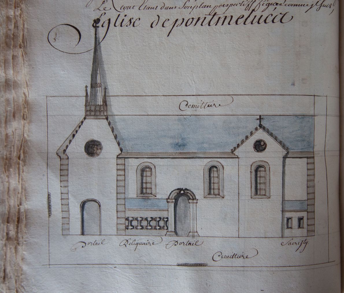 Eglise paroissiale de Pont-Melvez, Dessin à la plume aquarellé, 1731 (A. D. de La Vienne, 3H1 446)Immatriculation