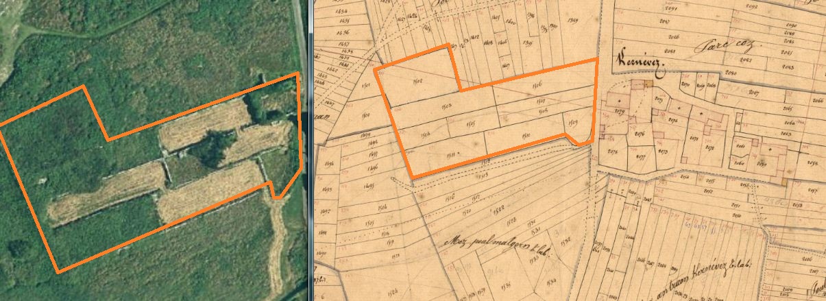 Kernevez : vue aérienne 2014 et extrait du cadastre de 1842 : permanence du parcellaire et des muretsImmatriculation
