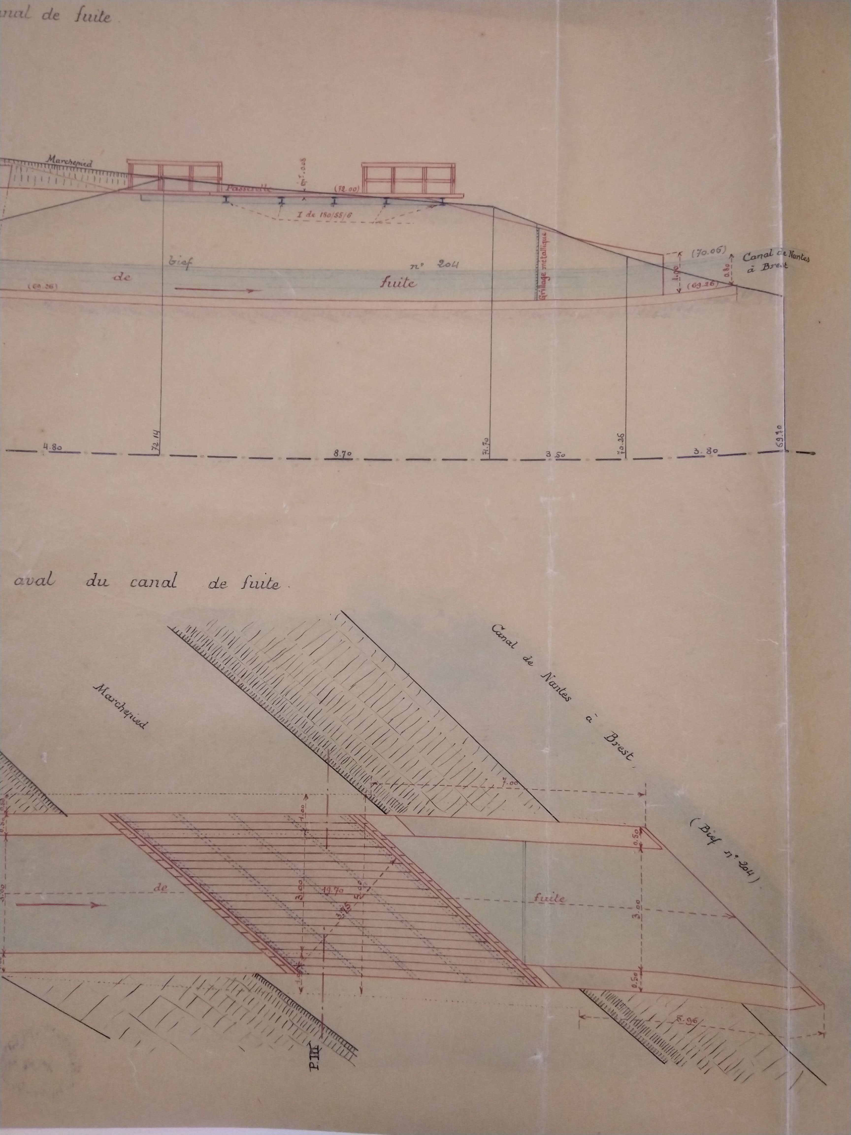 Emprunt de force motrice au bief n° 203 de Kergoat, commune de Plouguer- Coupe longitudinale développé suivant l'axe du canal de fuite - AD 3 S 58Immatriculation