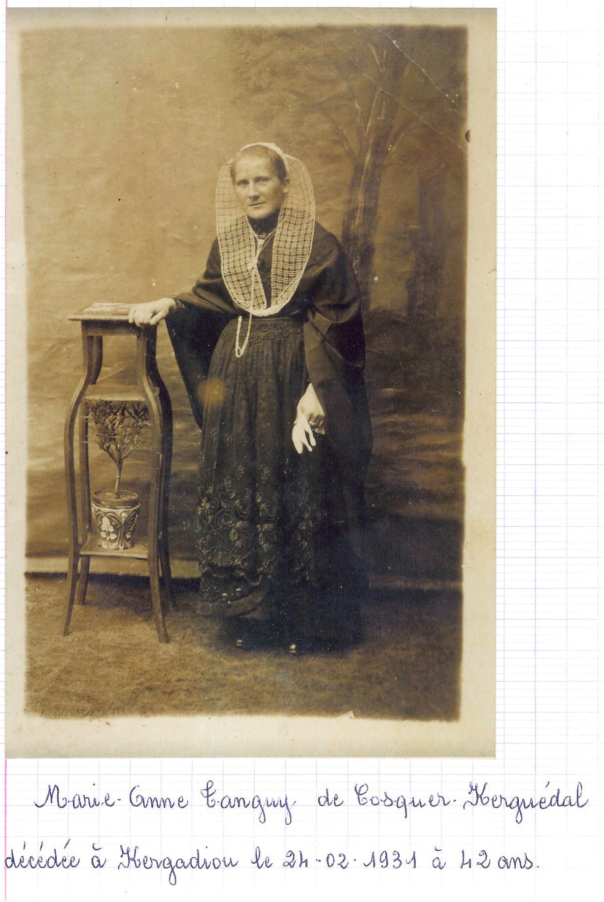 Marie-Anne TANGUY de Plouvorn (29) portant ici une chikolodenn en filet irrégulier. Cette technique était peu courante pour cette coiffe. Sans doute une imitation de la technique du secteur voisin territoire de la Sparlenn. Vers les annèes 1930. Photo transmise par Annie Gallic de Plouvorn.Immatriculation
