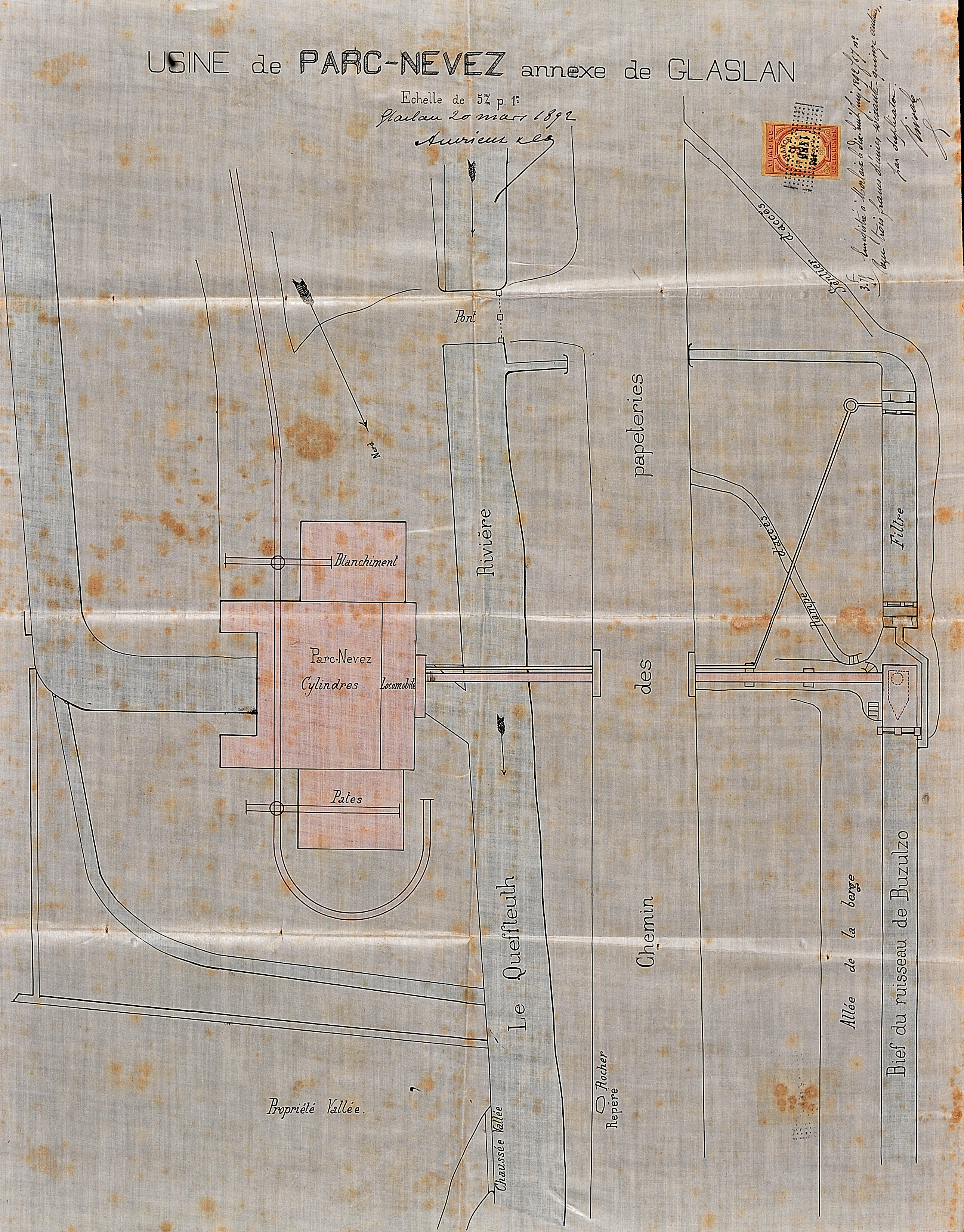 Plan de l'usine de Parc Névez, annexe de la papeterie de Glaslan, du 20 mars 1892 (Cote : 4E 132 189)Immatriculation