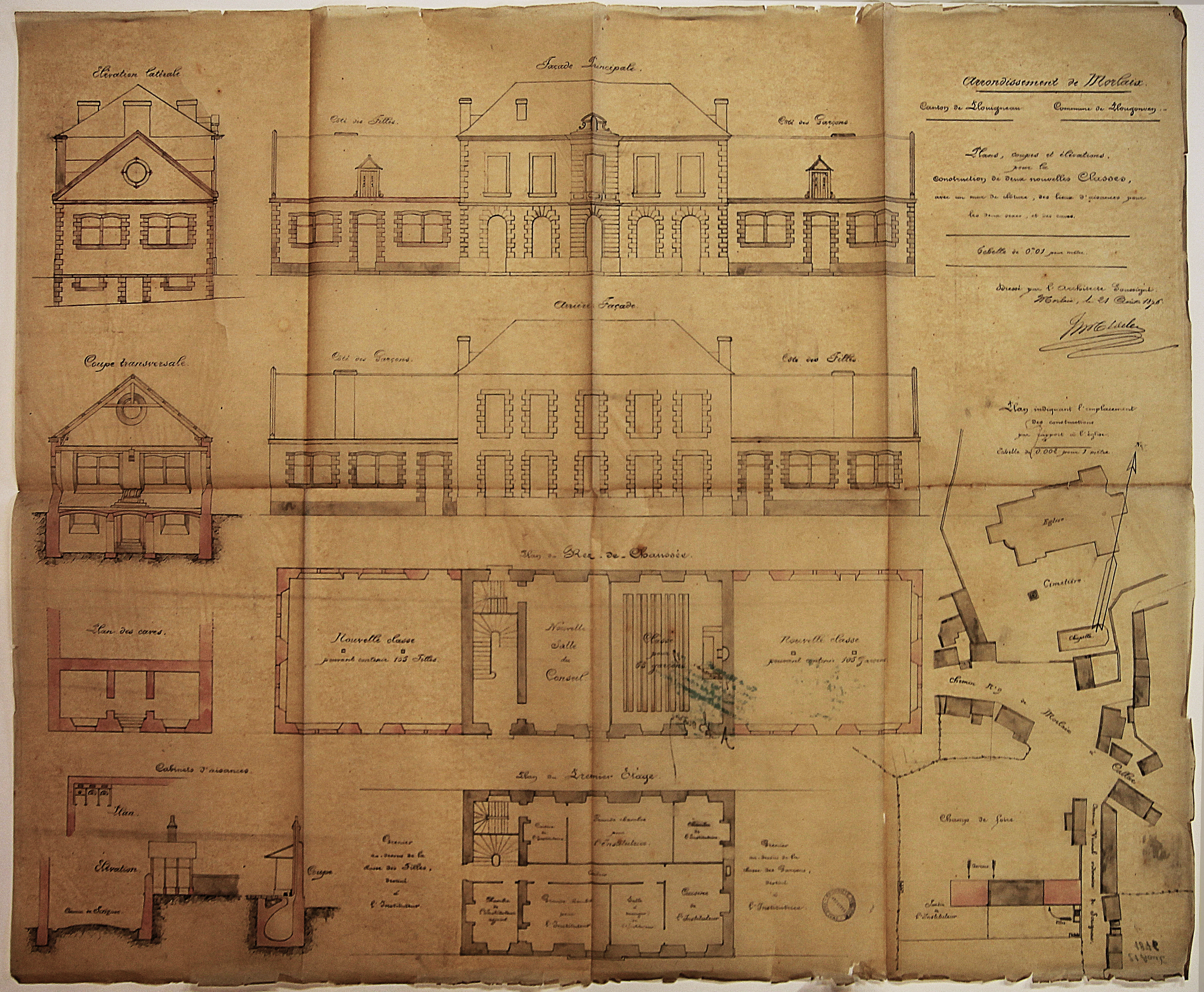 Plougonven, mairie : plans, coupes et élévations pour la construction de deux nouvelles classes, avec un mur de clôture, des lieux d'aisances pour les deux sexes, et des caves, dressé par l'architecte à Morlaix, 21 aout 1876 (AD29 - 2 O 1314)Immatriculation