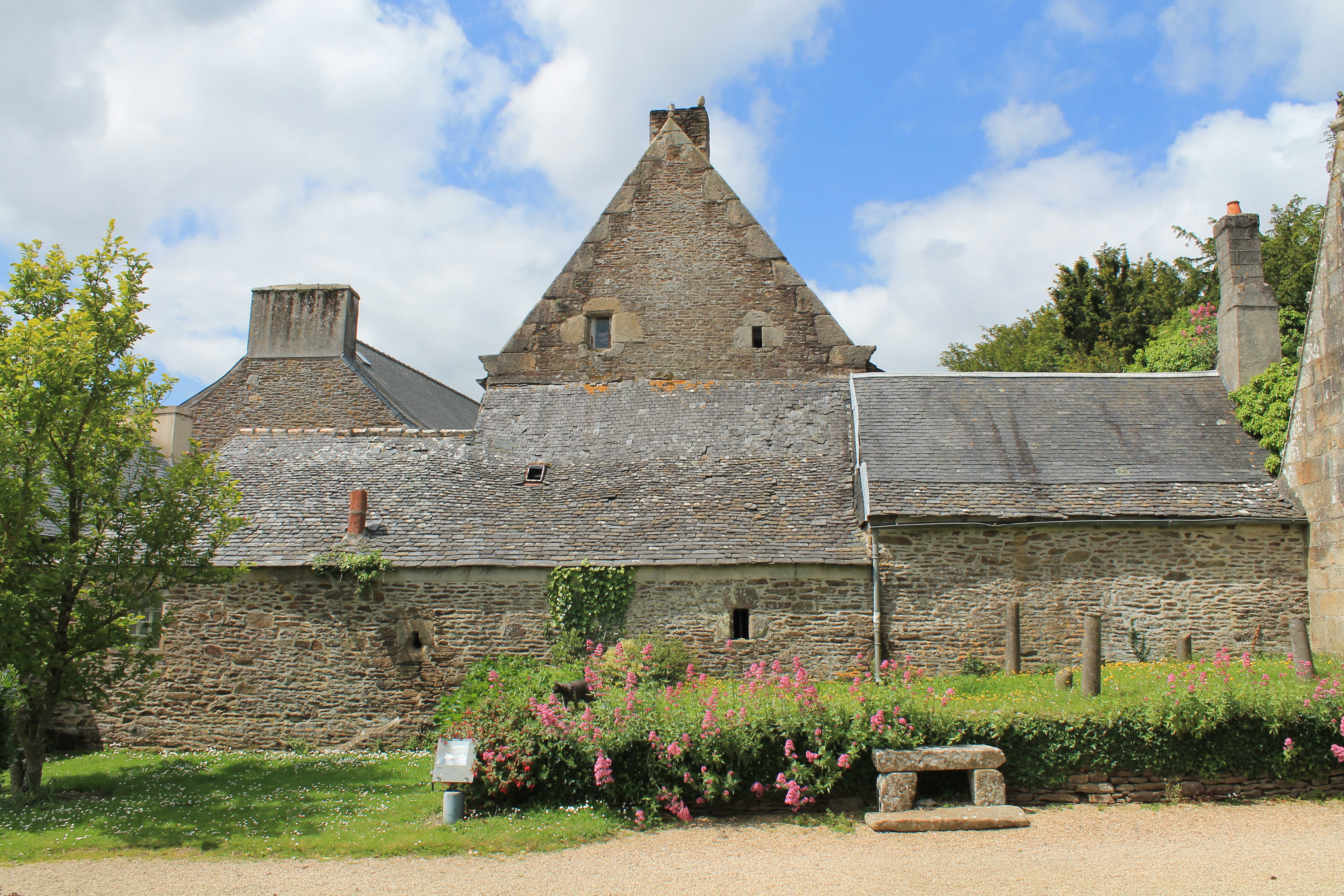 Plougonven, bourg - Ancienne maison noble de Monvouloir, remaniée, détail du pignon, vue depuis l'enclos paroissialImmatriculation