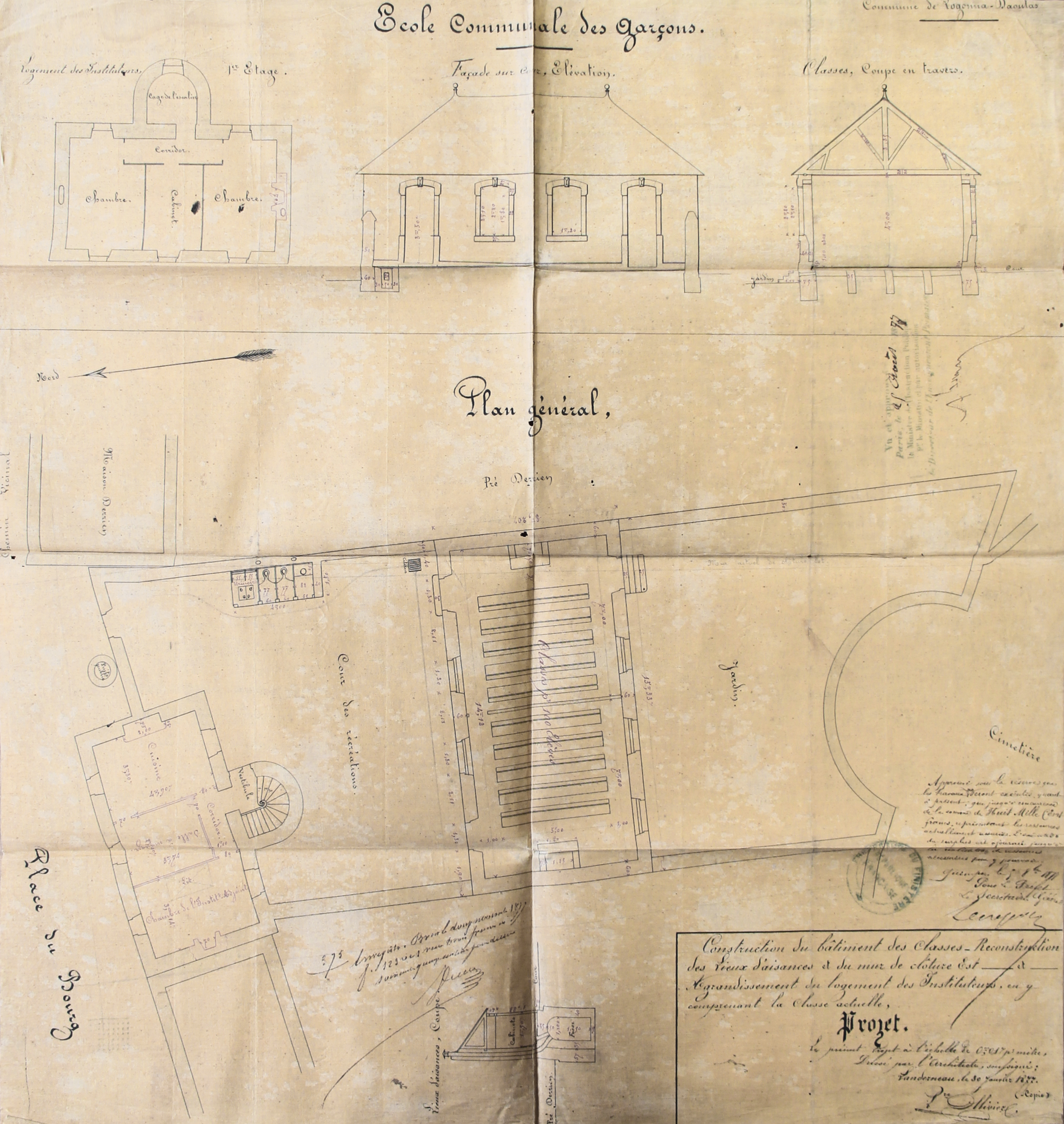 Logonna-Daoulas - Projet de construction d'une école communale des garçons, avec lieux d'aisance et agrandissement du logement des instituteurs, 1877 (Source : AD29, 553 E Dépot 18 - Logonna-Daoulas, Série M Bâtiments communaux)Immatriculation