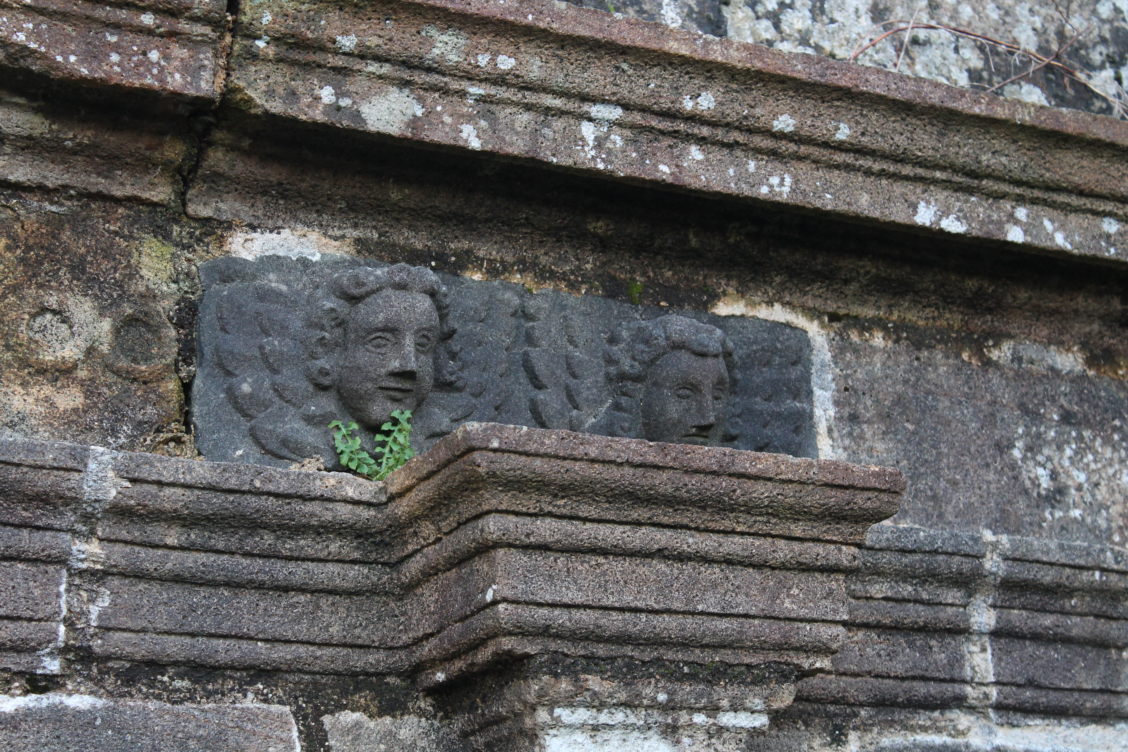 Logonna-Daoulas, église Saint-Nonna - Détail de deux têtes sculptées en kersantite, façade nord-ouest du double transeptImmatriculation