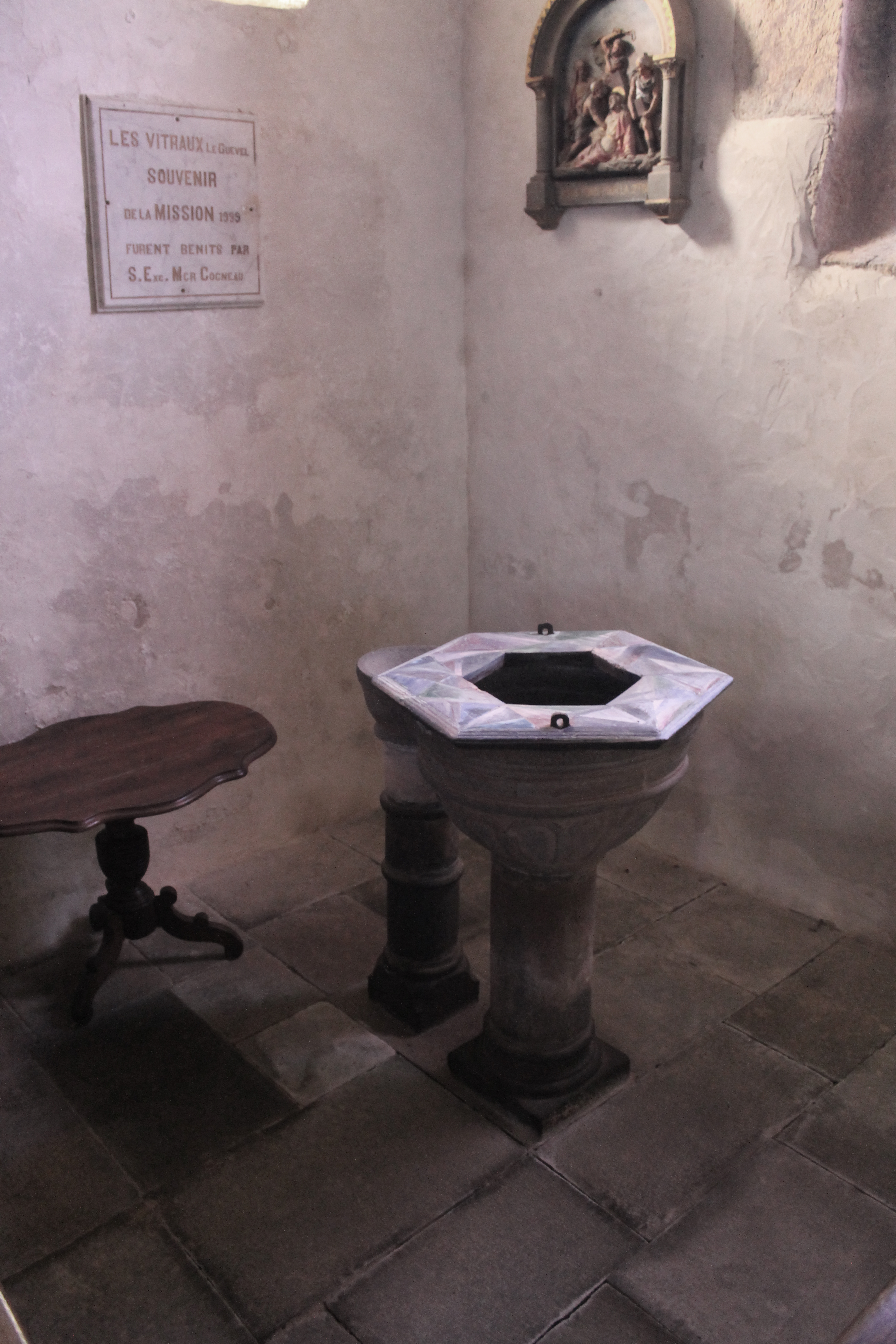 Logonna-Daoulas, église Saint-Nonna - Vue intérieure, bénitierImmatriculation