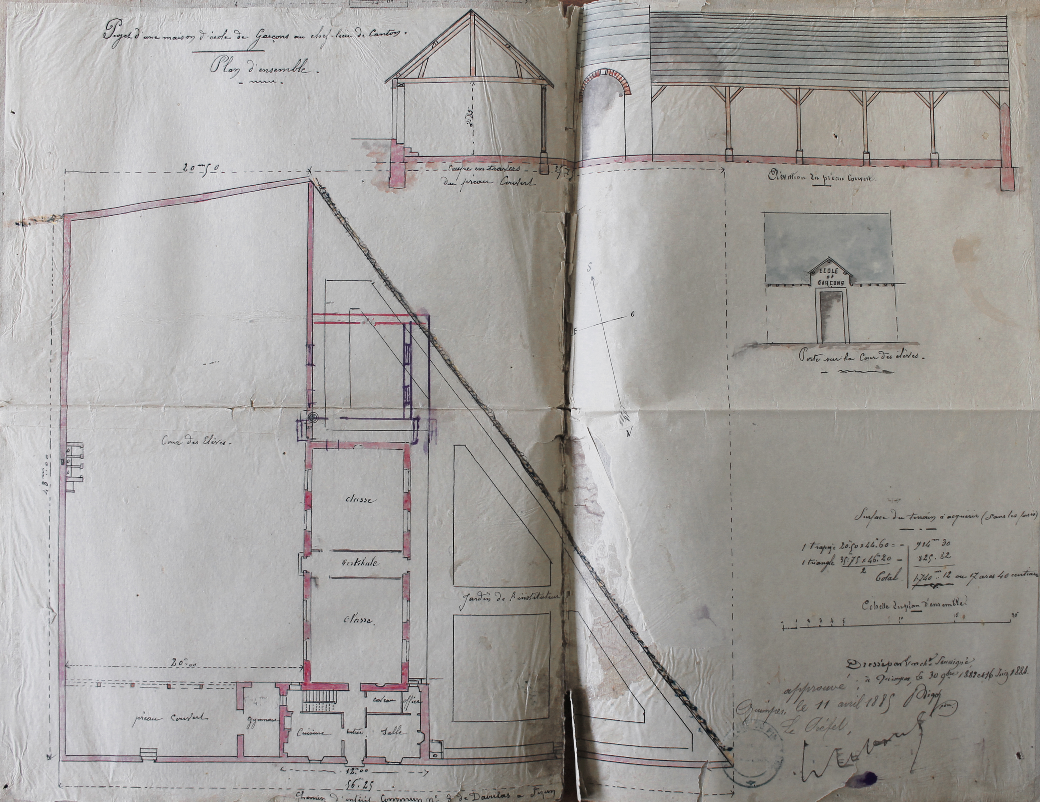 Daoulas, ville - Projet d'une maison d'école de garçons, plan d'ensemble, dressé les 30 octobre 1882 et 16 juin 1884, approuvé le 11 avril 1885 (AD29 - 512 E DEPOT art.21)Immatriculation