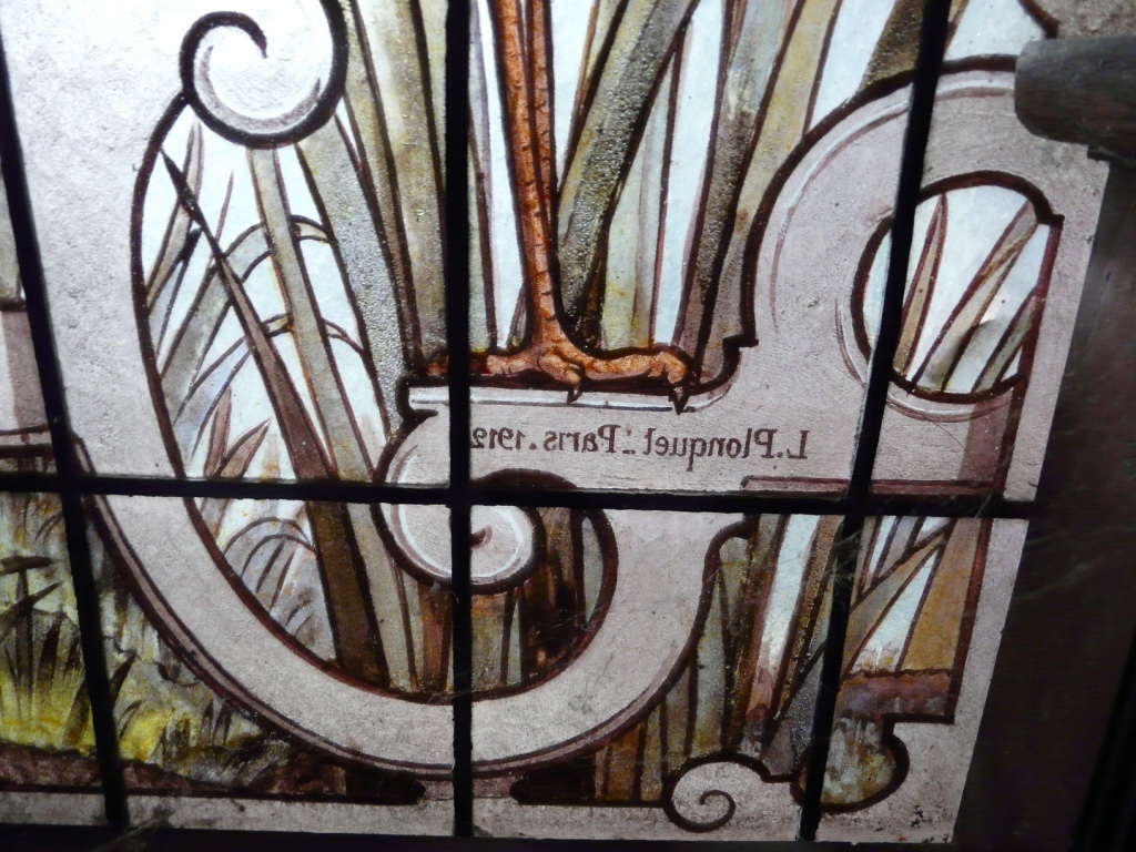 Signature de l'artiste verrier sur le vitrail dans la cage d'escalierImmatriculation