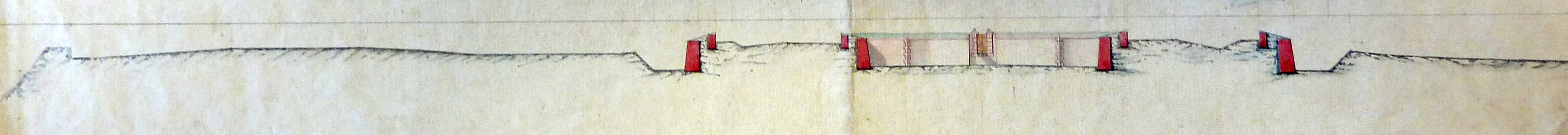 Coupe du fort Cézon, milieu du 19e siècle, Service historique de la Défense, Brest, série Z génie, E59 (reproduction : Patrick Jadé). Ce plan montre la coupe des deux demi-bastions encadrant la courtine du pont-levis ; à gauche : coupe du retranchement extérieurImmatriculation