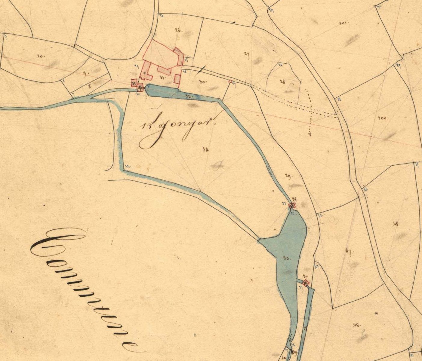 Le manoir de Kergongar et son moulin sur le cadastre de 1837 (A. D. du Finistère, 3 P 207/16)Immatriculation