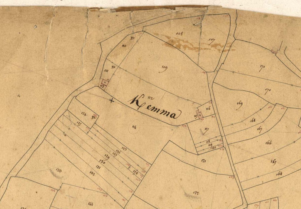Ker Emma sur le cadastre de 1836 (A. D. du Finistère, 3 P 287/3) ; ces parcelles et bâtiments sont à l'est des précédentsImmatriculation