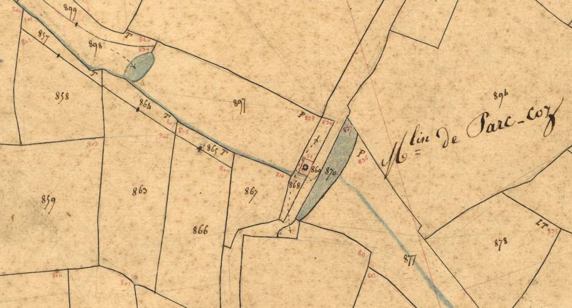Le moulin de Parc Coz sur le cadastre de 1837 (A. D. du Finistère, 3 P 287/9)Immatriculation