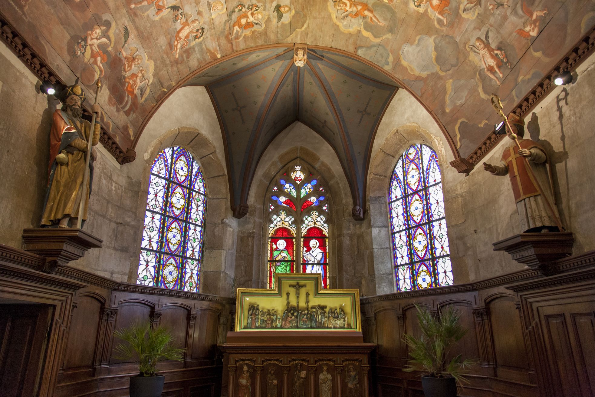 Eglise Saint-Jacques de Locquirec - vue intérieure du chœur à noues multiples et baie 0 à remplage flamboyantImmatriculation