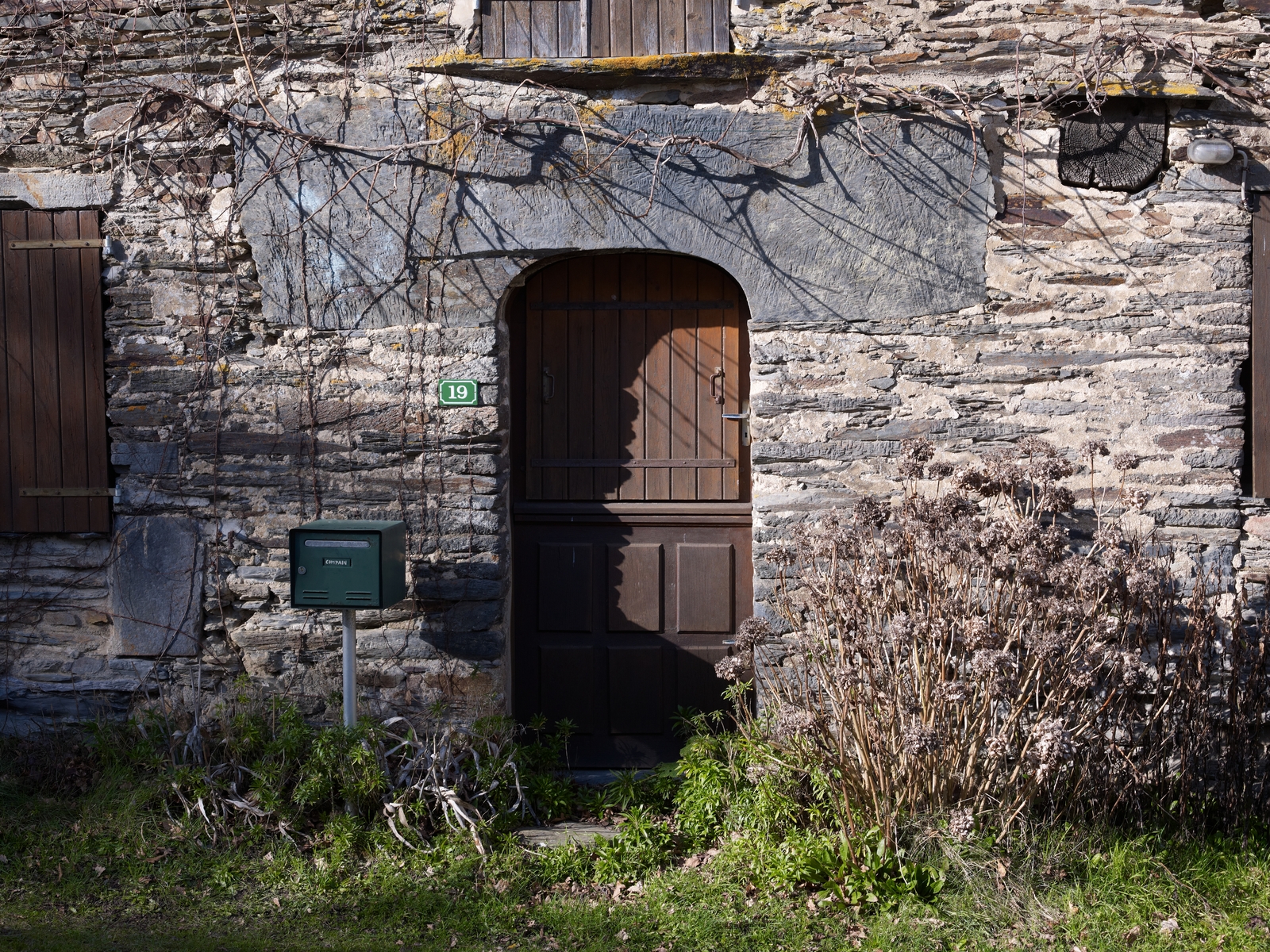 La Brousse, ferme, aujourd'hui maison : vue rapprochée de la porte ; l'énorme linteau typique de cette zone et l'about de poutre sont protégés par une mince dalle de schiste, le larmier (état en 2015)Immatriculation