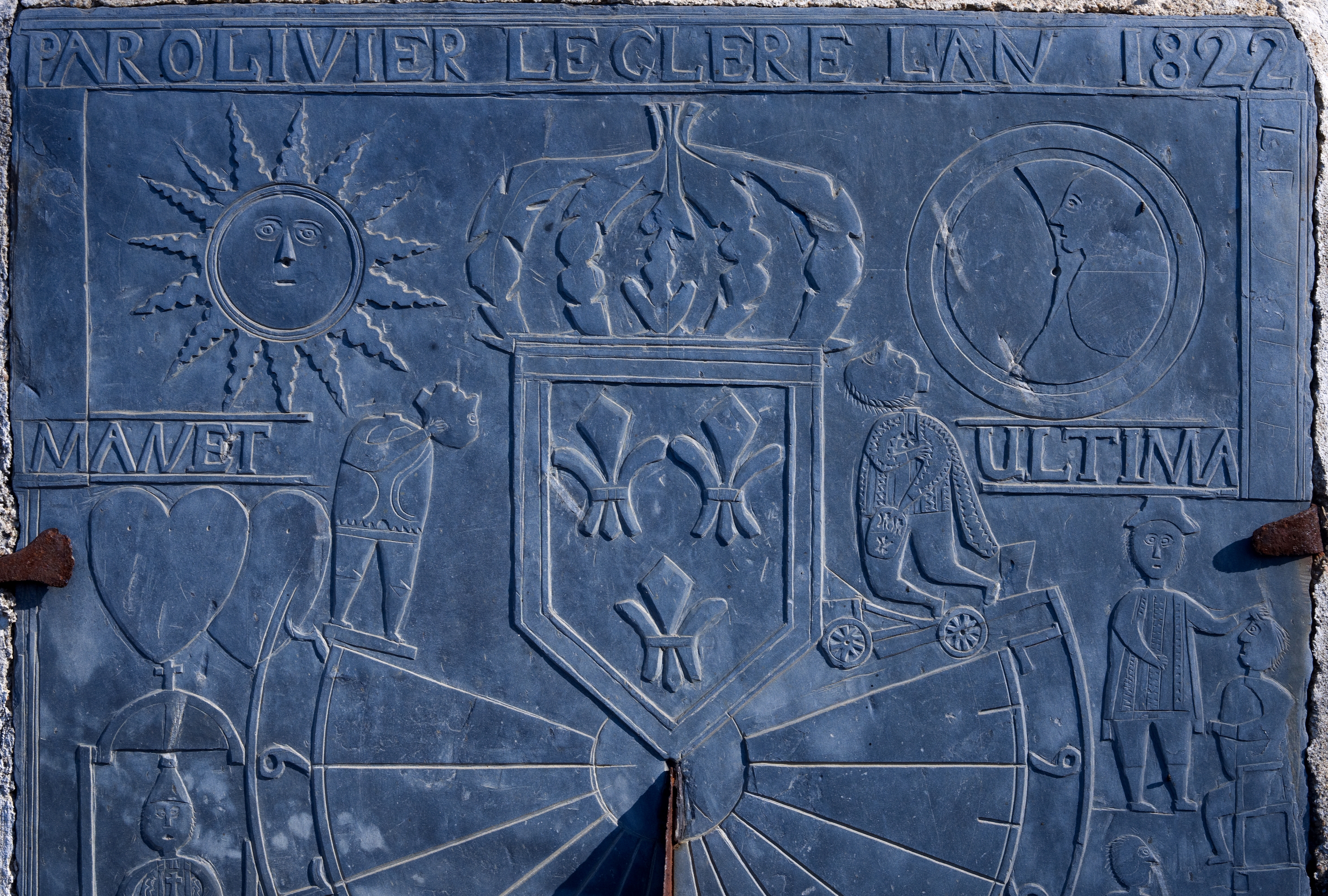 Partie supérieure : lune et soleil encadrant la couronne qui couronne le blason fleurdelysé, encadré de la guillotine et de l'homme guillotiné.Immatriculation
