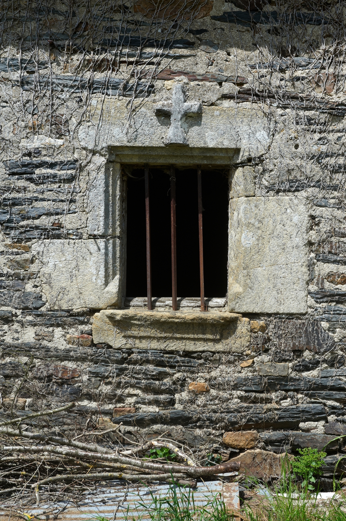 Maison 4, élévation sud : fenêtre remployée, décorée d'une croix (état en 2015)Immatriculation