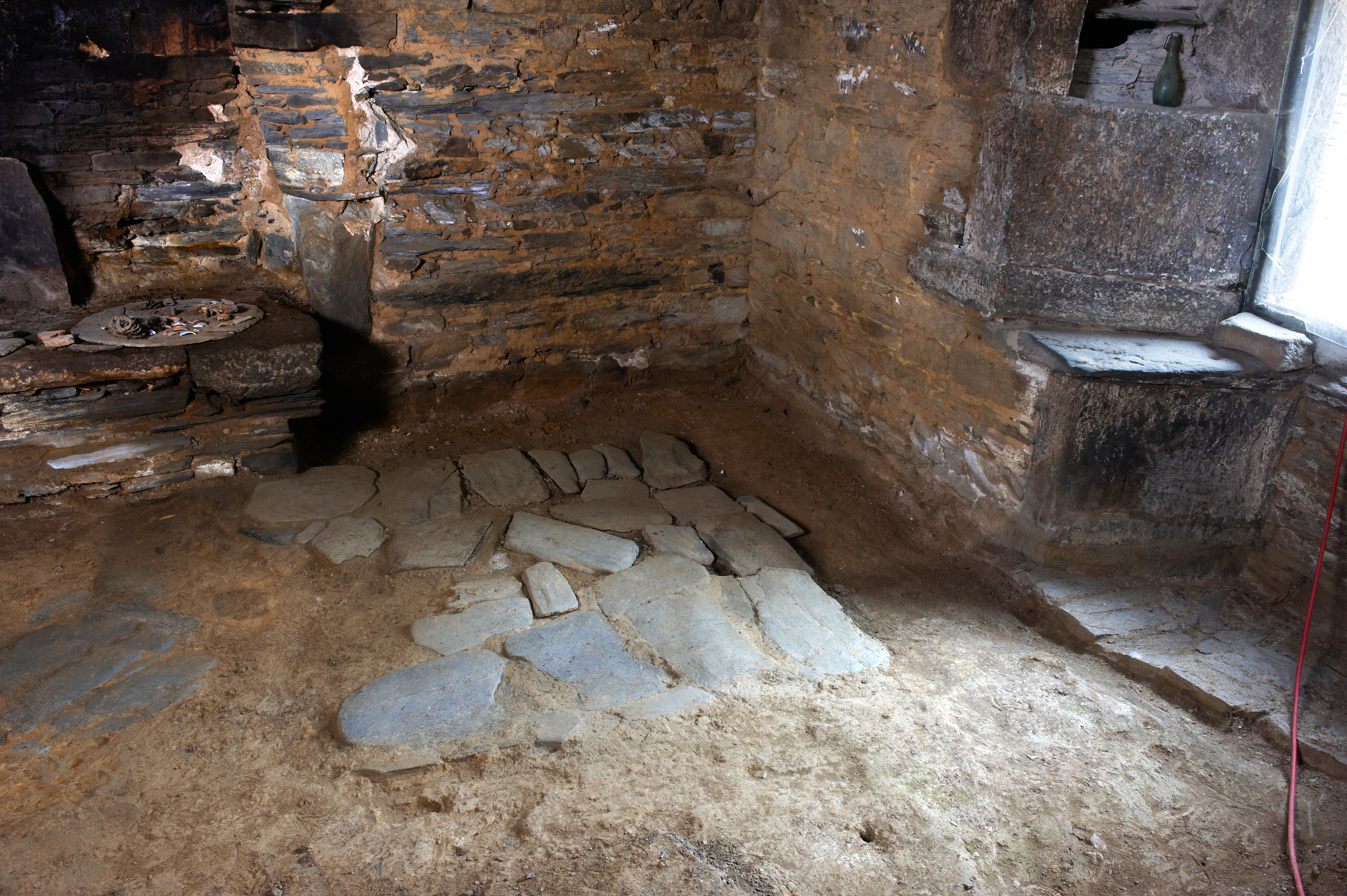 Manoir, rez-de-chaussée, salle : pavement d'origine entre la cheminée et la fenêtre, une fois le niveau du sol retrouvé (état en 2015)Immatriculation