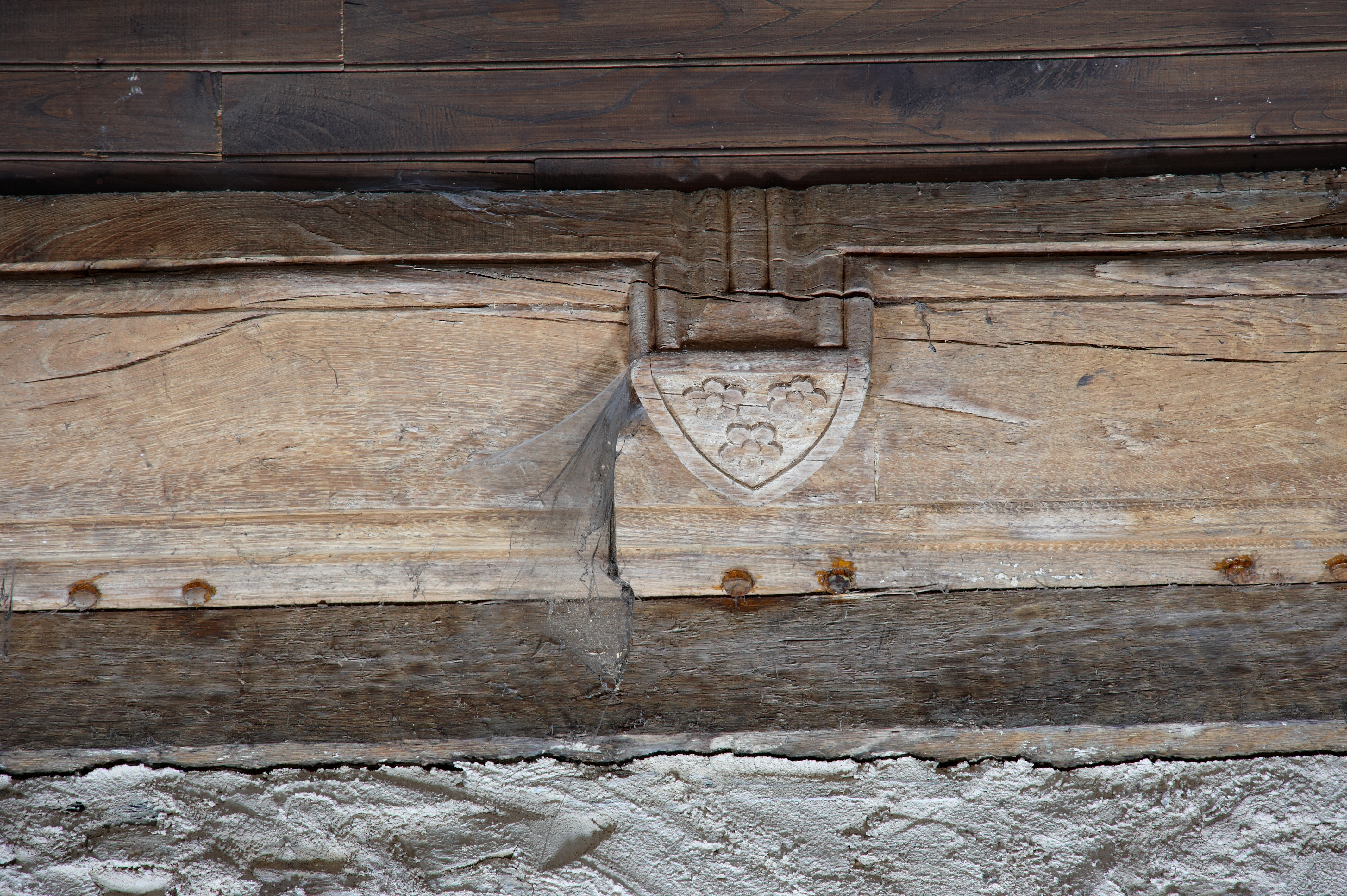 Transept, bras nord, mur est : la sablière, restaurée, porte des écus dont les armoiries sont celles de la famille de Sérent (état en 2015)