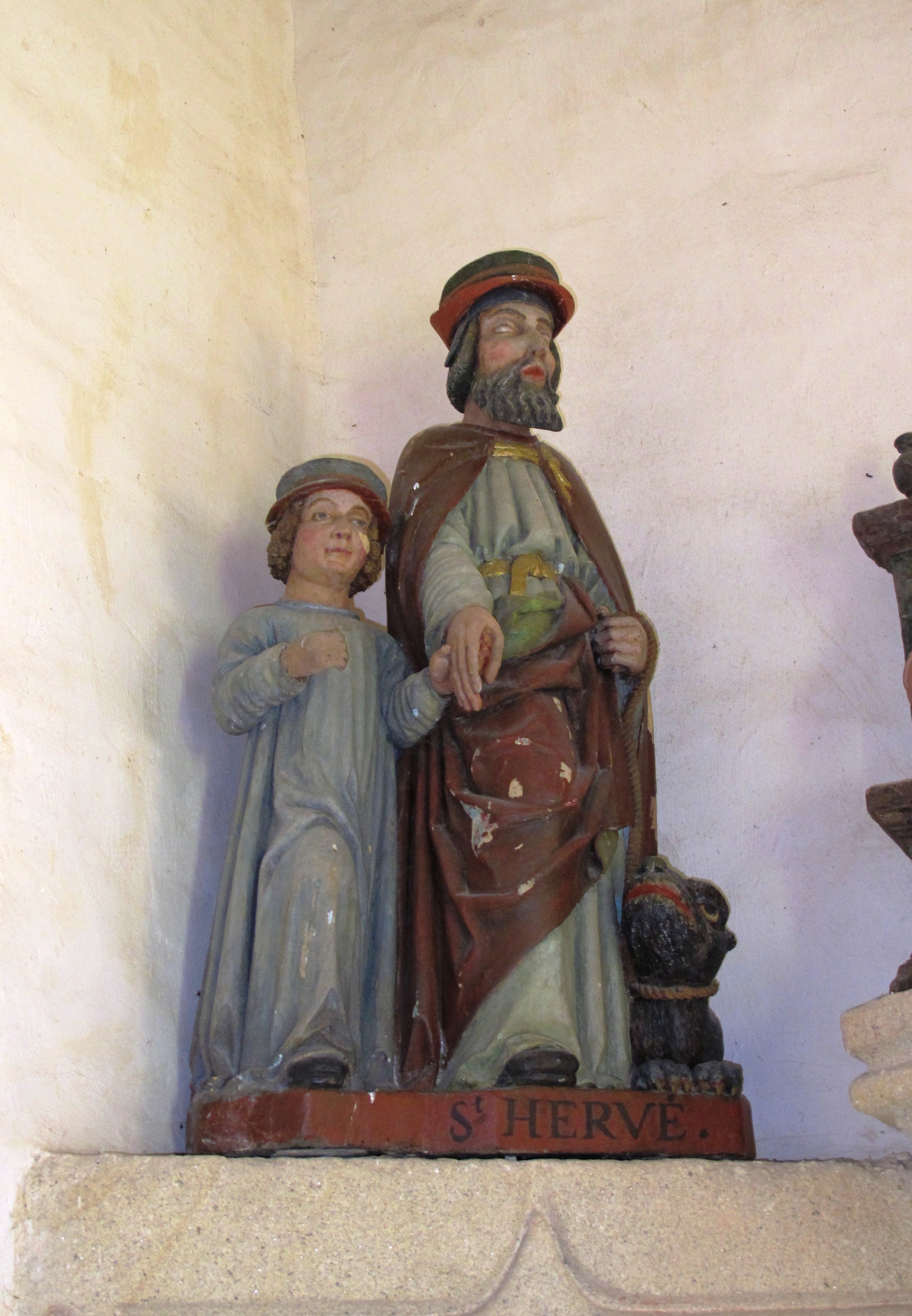 Groupe sculpté (petite nature, d'applique) : saint Hervé dit saint Hervé, son guide Guiharan et le loup, chapelle Saint-Houarno ou Saint-Hervé (Langoëlan),