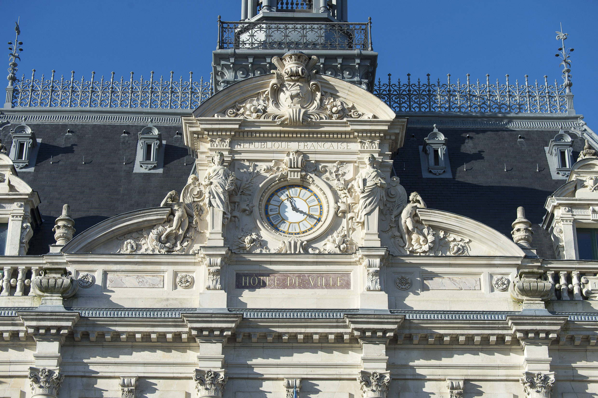 Fronton central orné de l'horloge et encadré par des cariatides engainées, figures de l'Instruction et du Travail, et par le blason de la villeImmatriculation