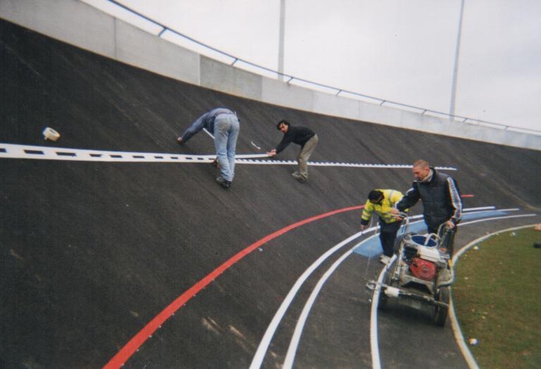 Traçage des différentes zones et lignes : côte d'azur, ligne de mensuration, ligne des sprinters et ligne des stayers (3 mars 2004)