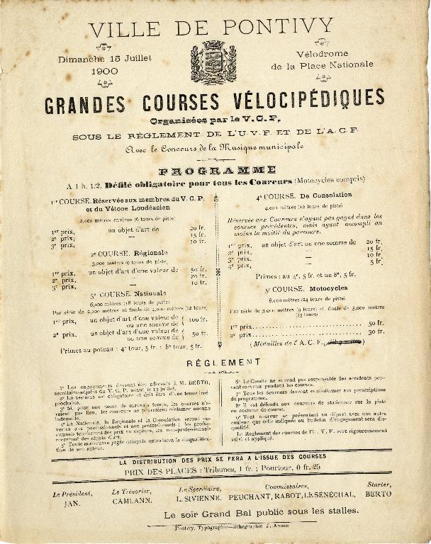 Programme des grandes courses vélocipédiques organisées par le Véloce-Club Pontivyen au vélodrome de la Place nationale pour le dimanche 15 juillet 1900Immatriculation