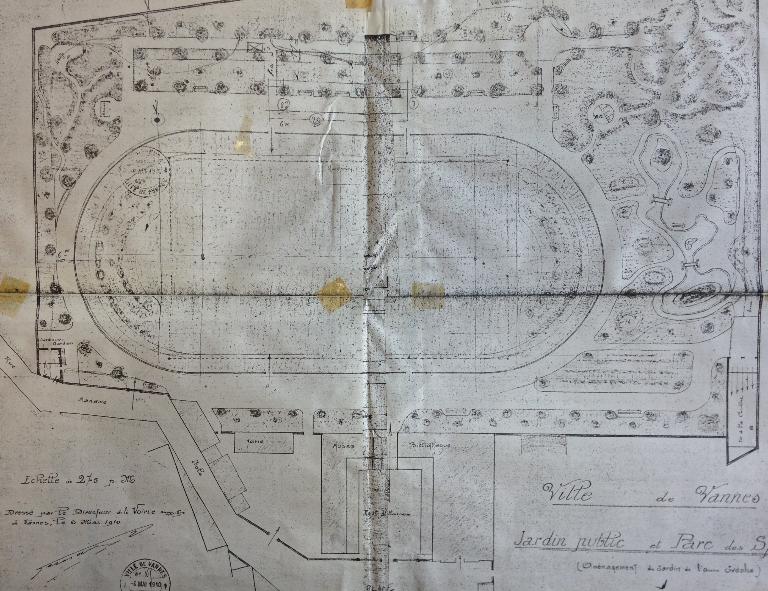 Plan de l'aménagement de l'ancien Évêché en Jardin public et Parc des Sports et Fêtes (6 mai 1910)Immatriculation