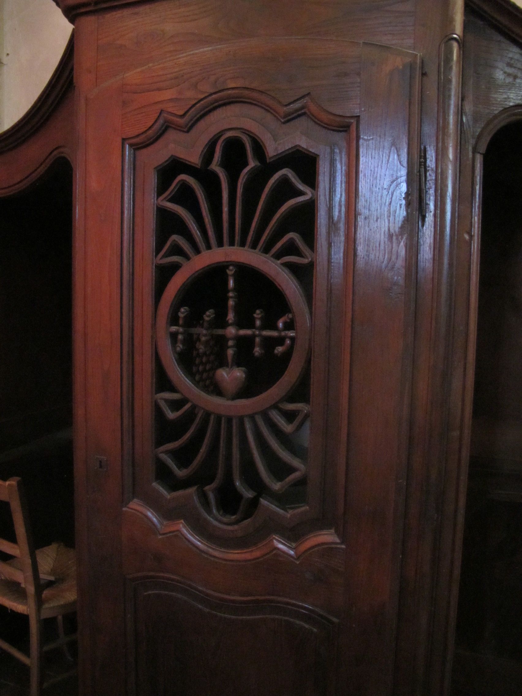 Confessional : panneau supérieur du vantail central orné de IHS et d'un coeur (état en 2015)Immatriculation
