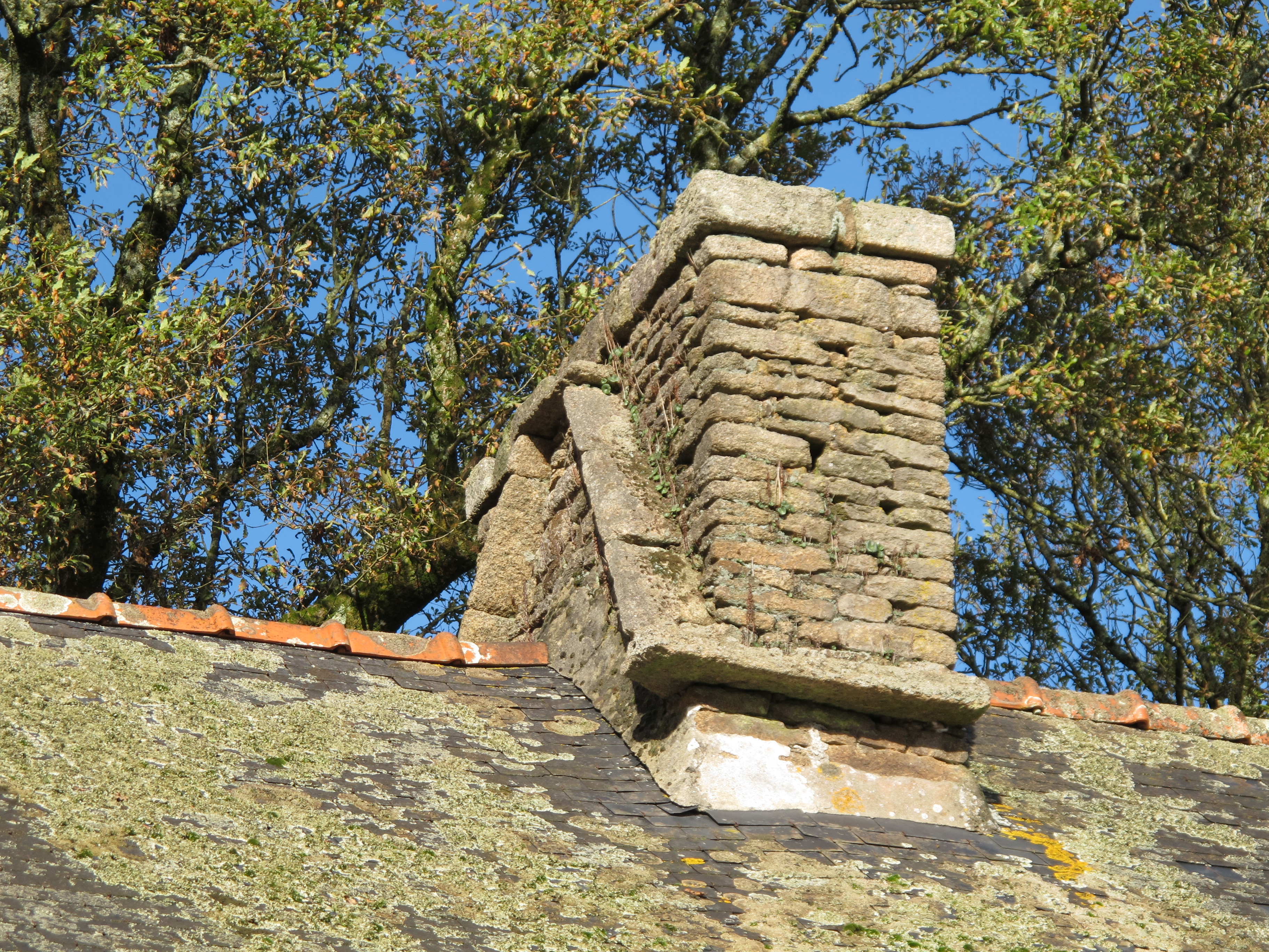 Maison parcelle ZV 52, 51, 68, détail du solin en pierre de taille de la souche médiane protégeant l'ancienne toiture de chaume, état en 2015Immatriculation