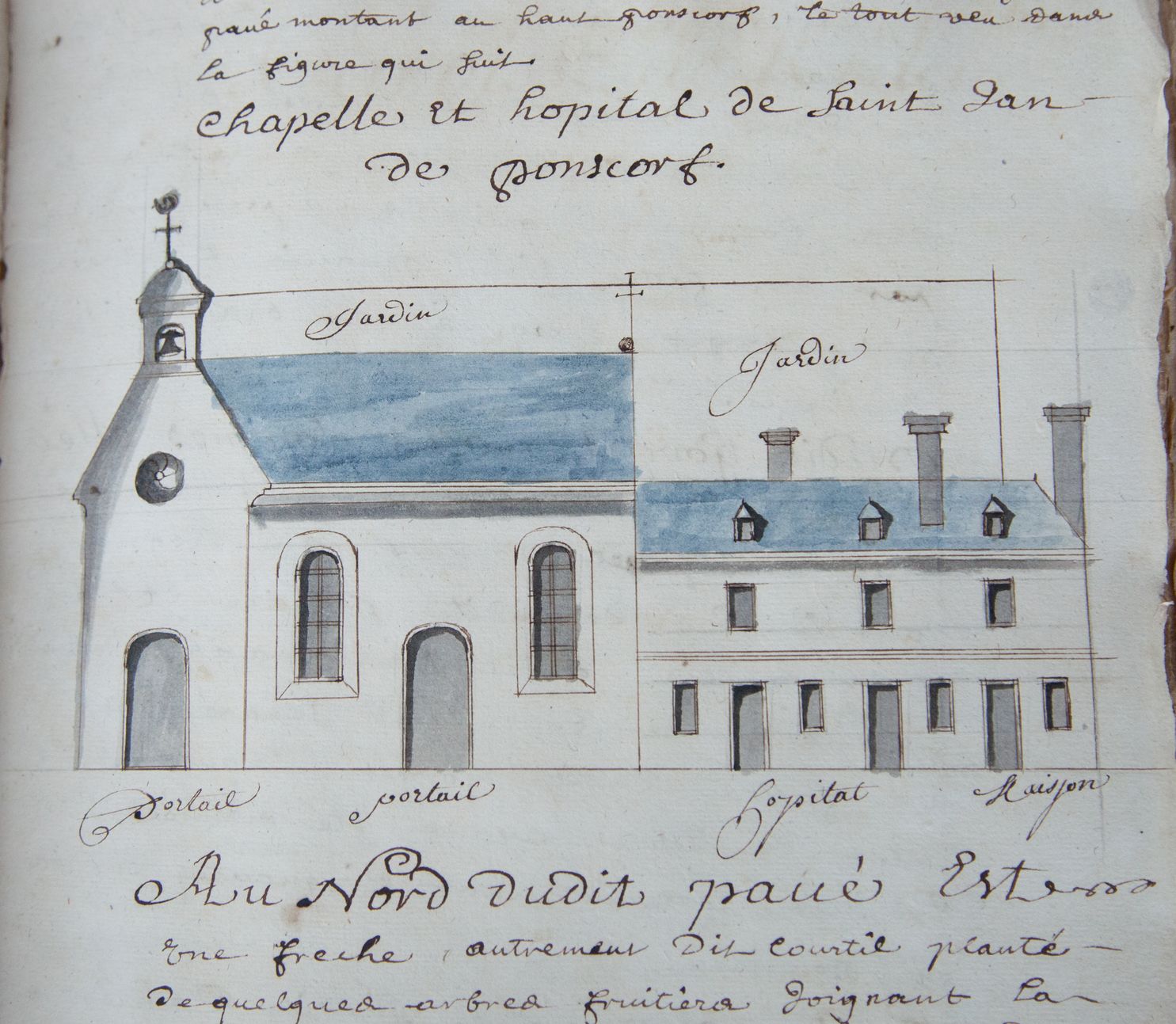 Chapelle de Saint-Jean de Pont-Scorff. Dessin à la plume aquarellé, 1731 (A. D. de La Vienne, 3H1 448)Immatriculation