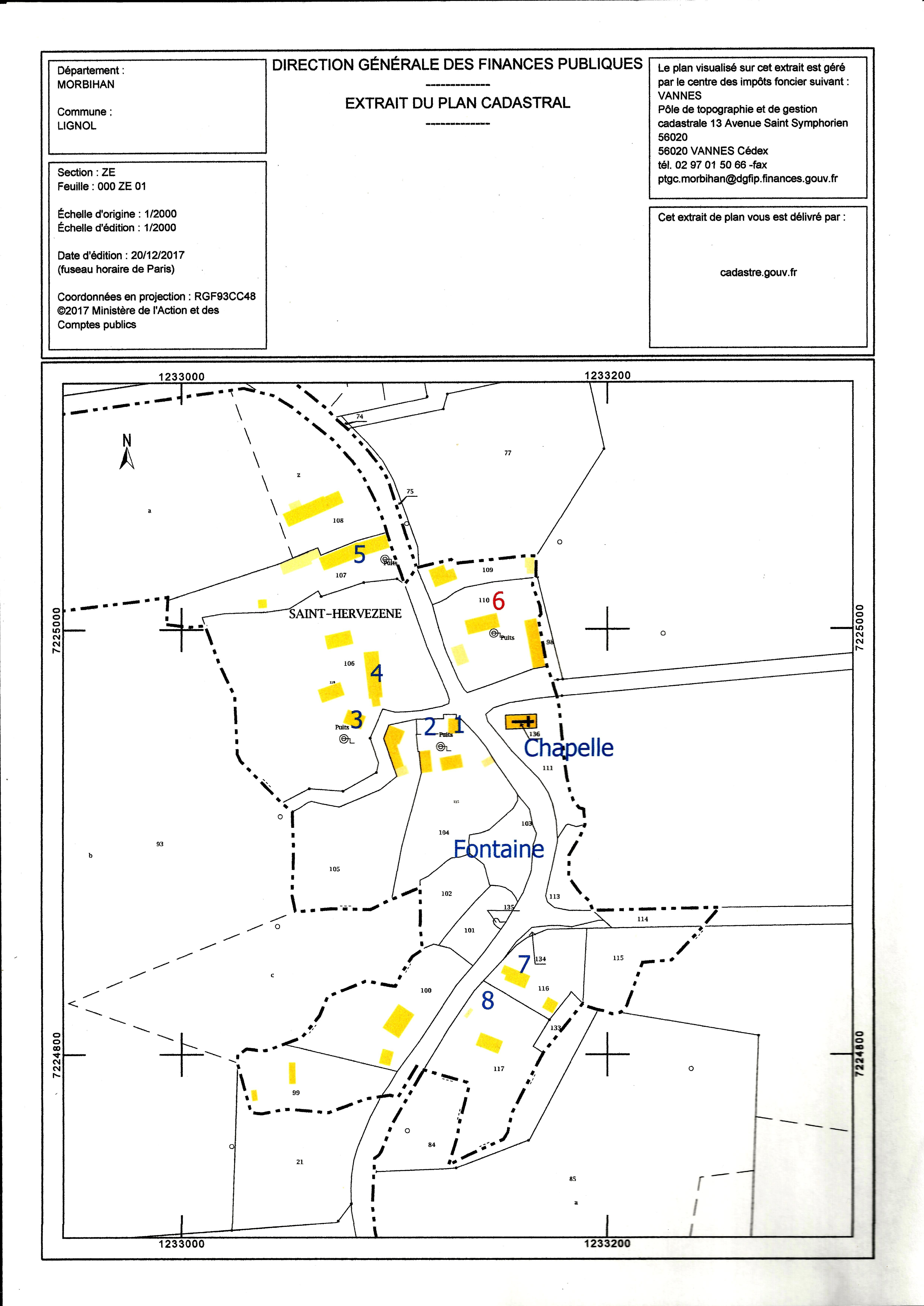 Localisation des édifices repérés sur le plan cadastral 2015 (plan DGFP) ; en rouge ferme étudiéeImmatriculation