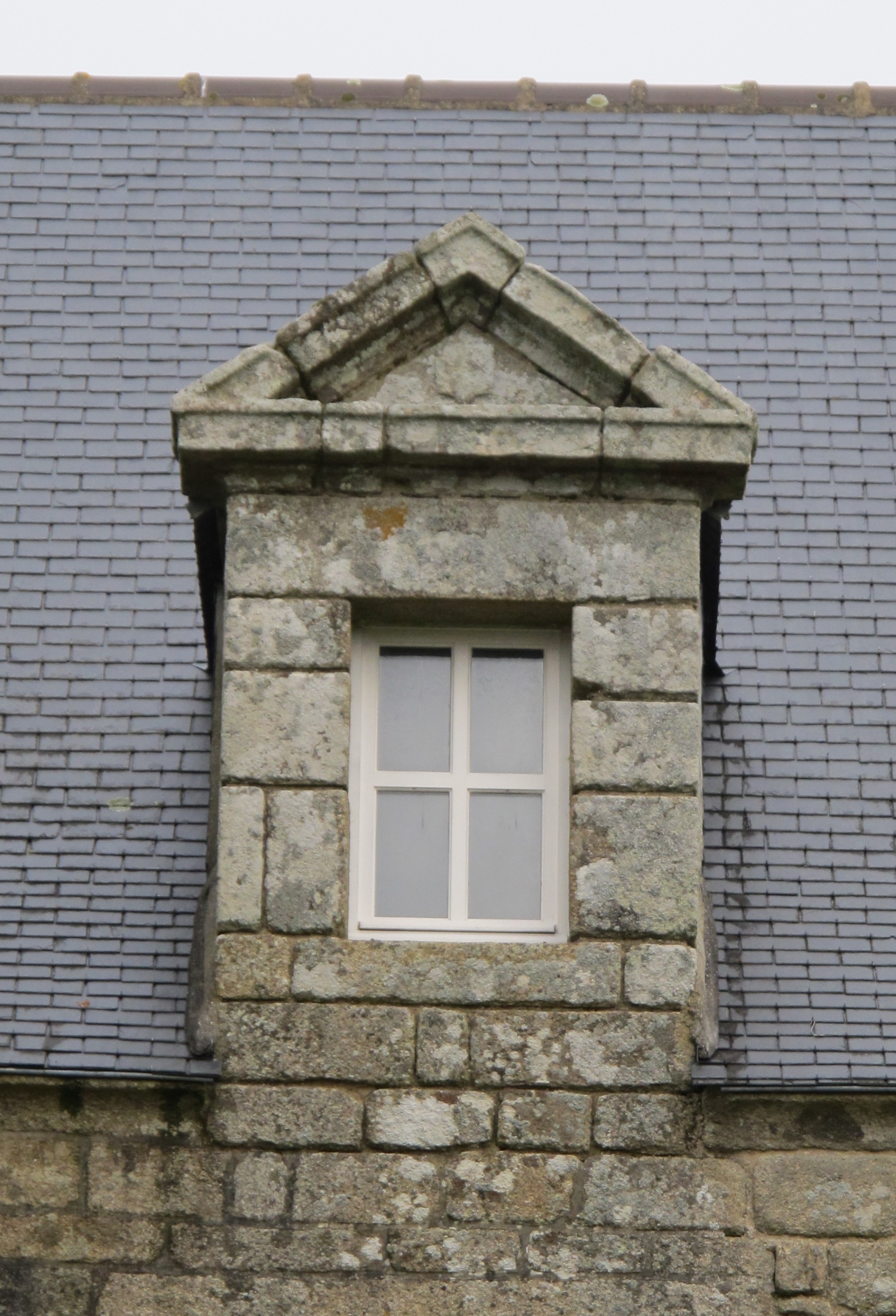 Elévation sud, lucarne portant le blason des Kerouallan, état en 2015Immatriculation
