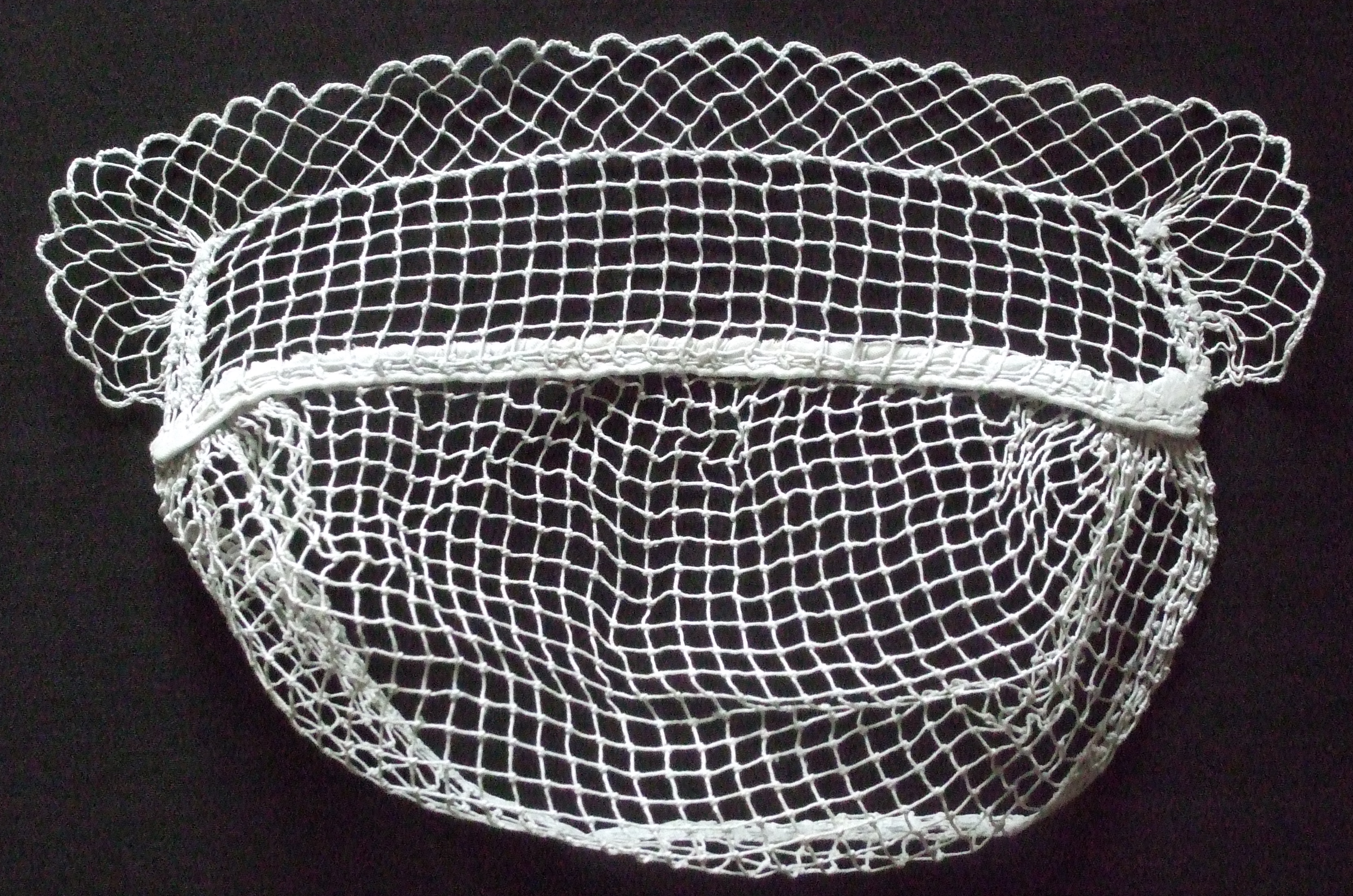 Coiffe en filet à maille carrée sans broderie et avec la visagière bordée d’une pièce en filet à maille losange. Collection et photo de Michel Rocher.Immatriculation