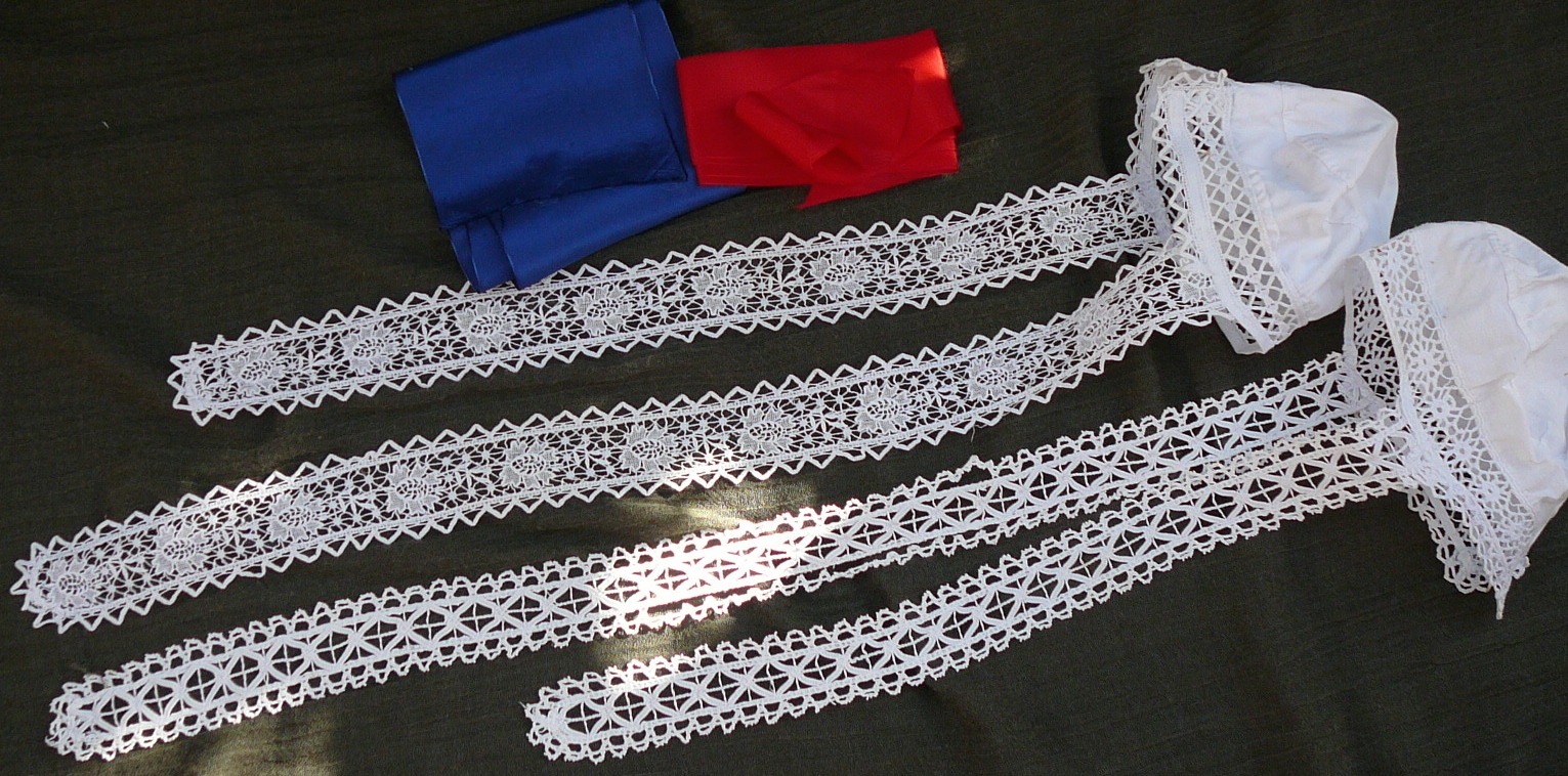 Coiffe du XXe siècle. Photo du bonnet ou sous-coiffe. Le ruban de couleur, souvent assorti à la couleur du tablier, se fixait sur le bonnet pour être vu en transparence sous la coiffe.En période de deuil, le ruban porté pendant une année était de couleur noire (Collection particulière de Yvonne Olivier)Immatriculation