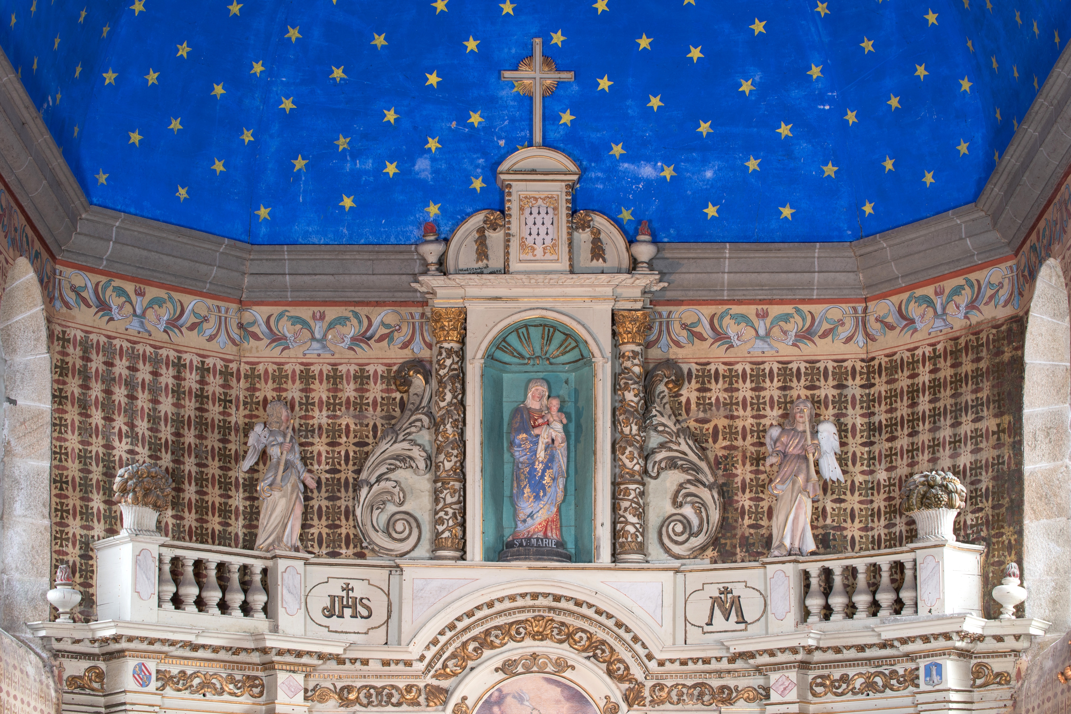 Grand retable du choeur provenant de Runan, bois polychrome, 1727 (classé M.H.). Détail de la niche supérieureImmatriculation