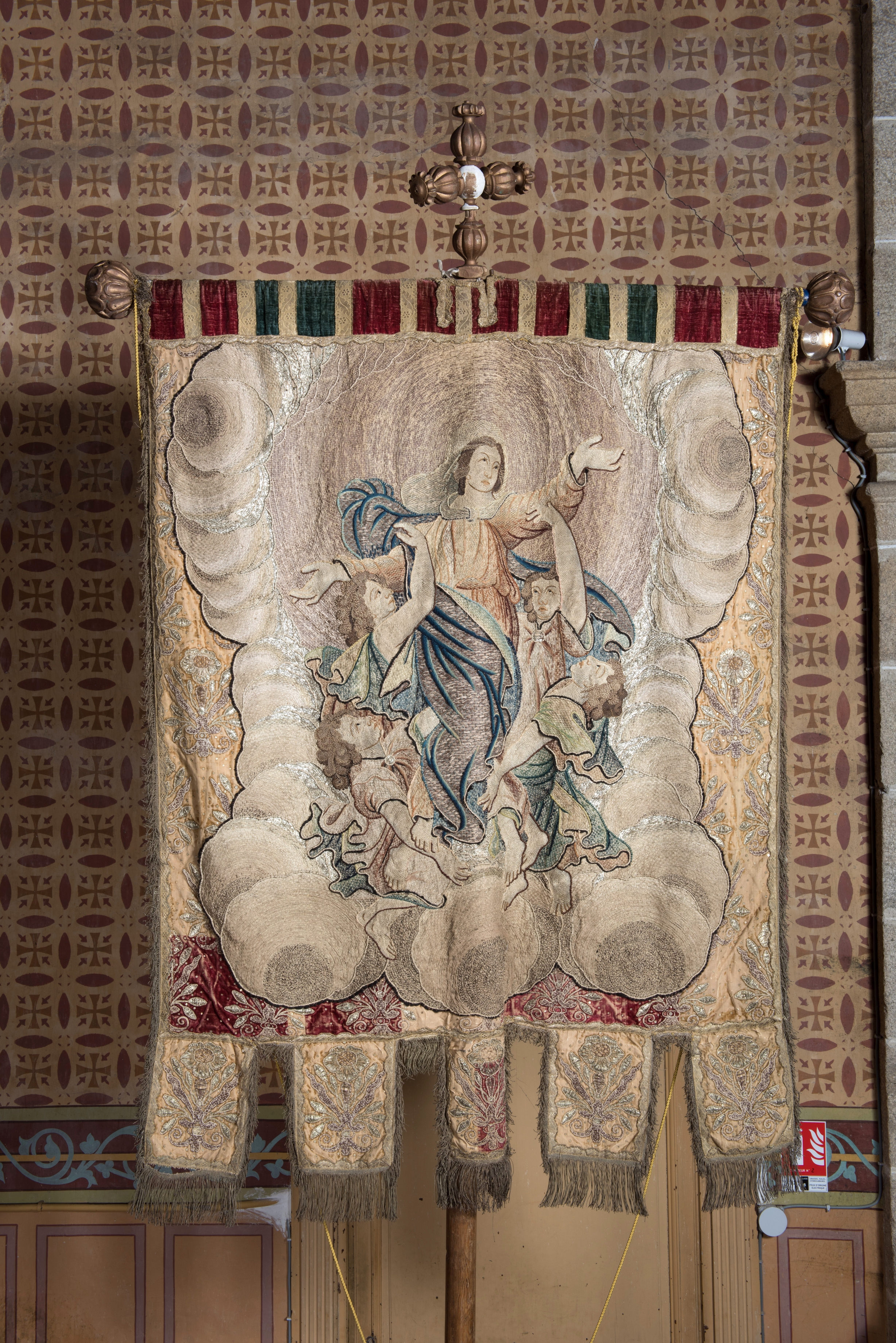 Bannière de procession, velours, soie brodée de fils d'or et d'argent, 18e siècle (classé M.H.). Verso : Assomption de la ViergeImmatriculation