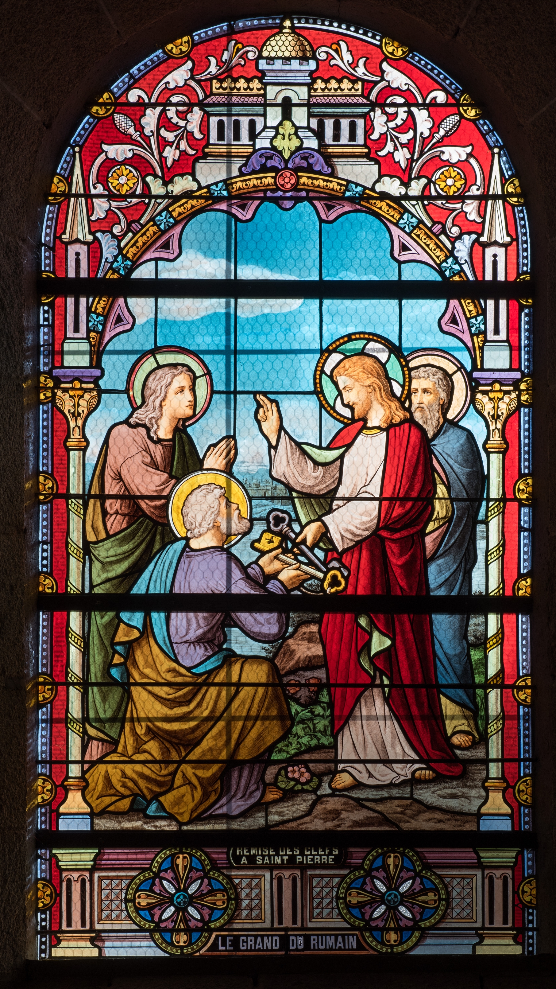 Verrière. Remise des clefs à saint Pierre. Bessac, maître-verrier (Grenoble), 1913-1914. Vue généraleImmatriculation