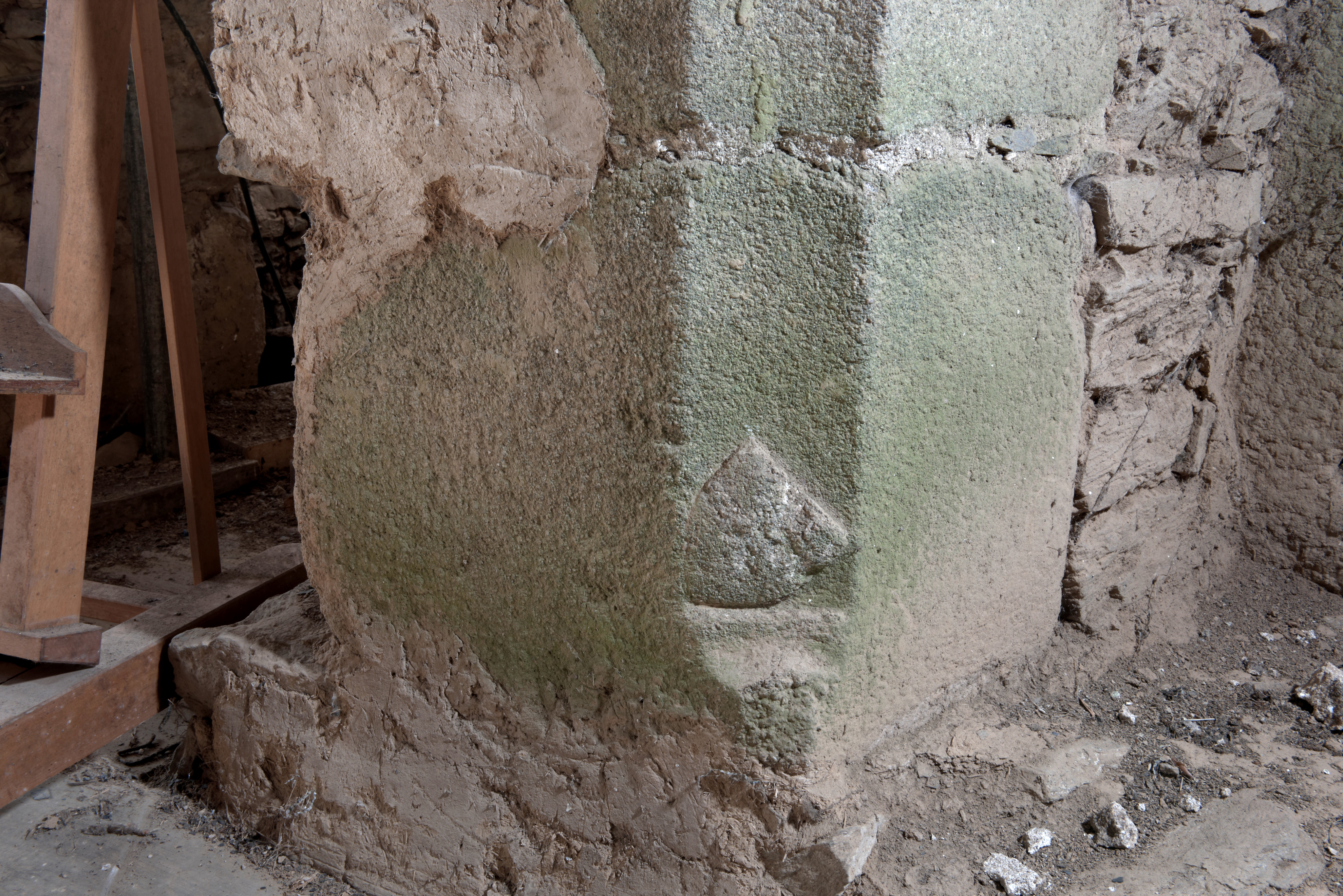 Cheminée de la salle de guet. Base d'un piédroit. Détail d'un blason aux armes des Coëtfrec : d'argent à la fasce de gueulesImmatriculation