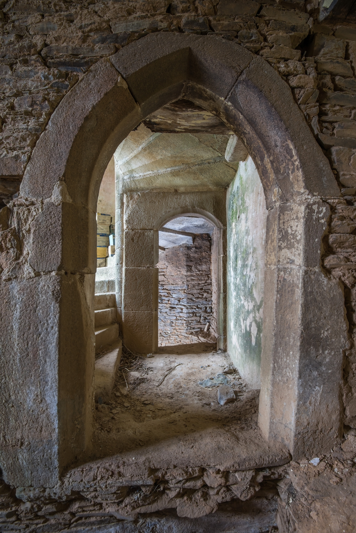 Chapelle du manoir. Jeu de perspective entre la porte ouvrant sur la tour et la porte ouvrant sur l'escalier de la caveImmatriculation