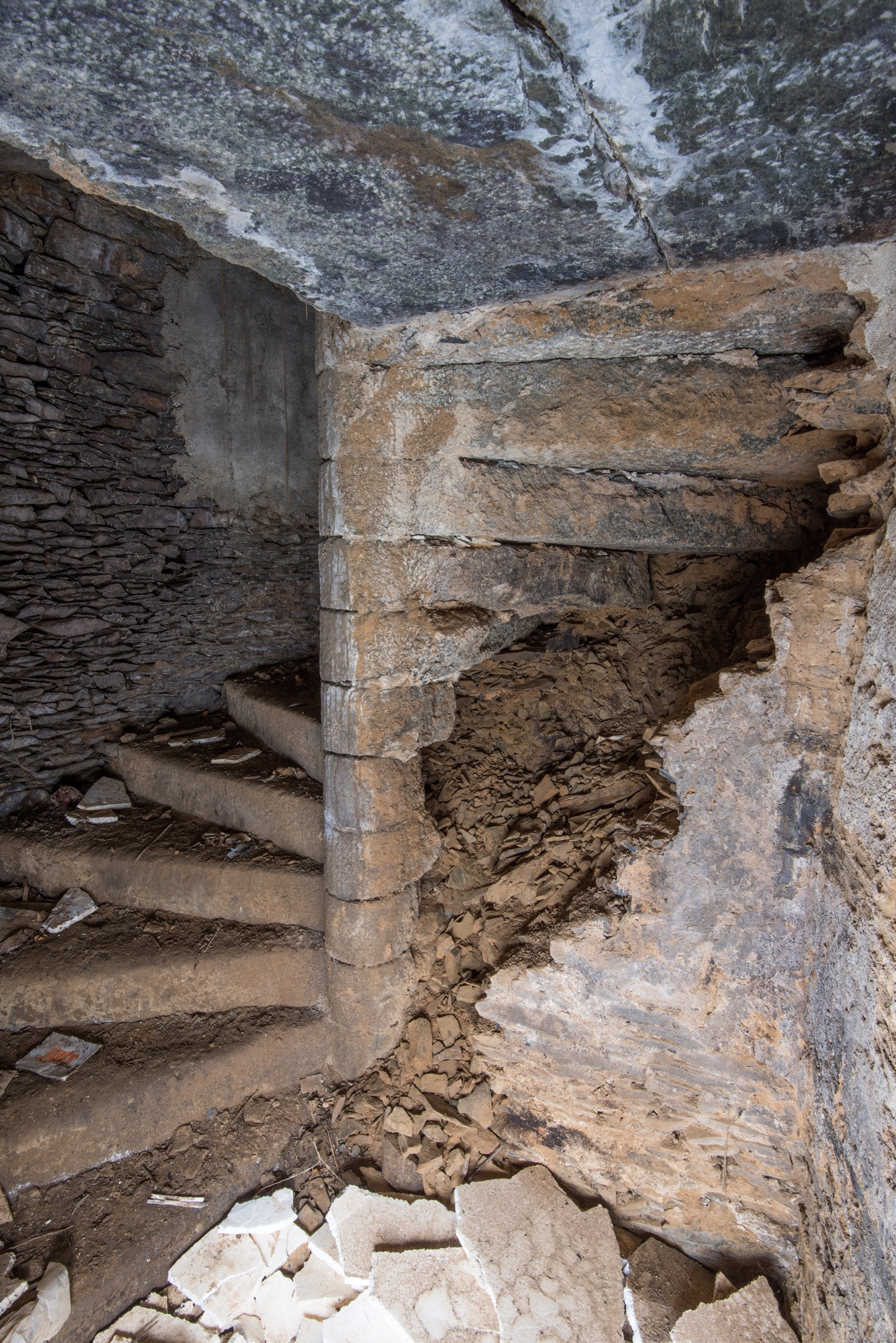 Tour d'escalier. Détail de la volée de marches conduisant à la caveImmatriculation