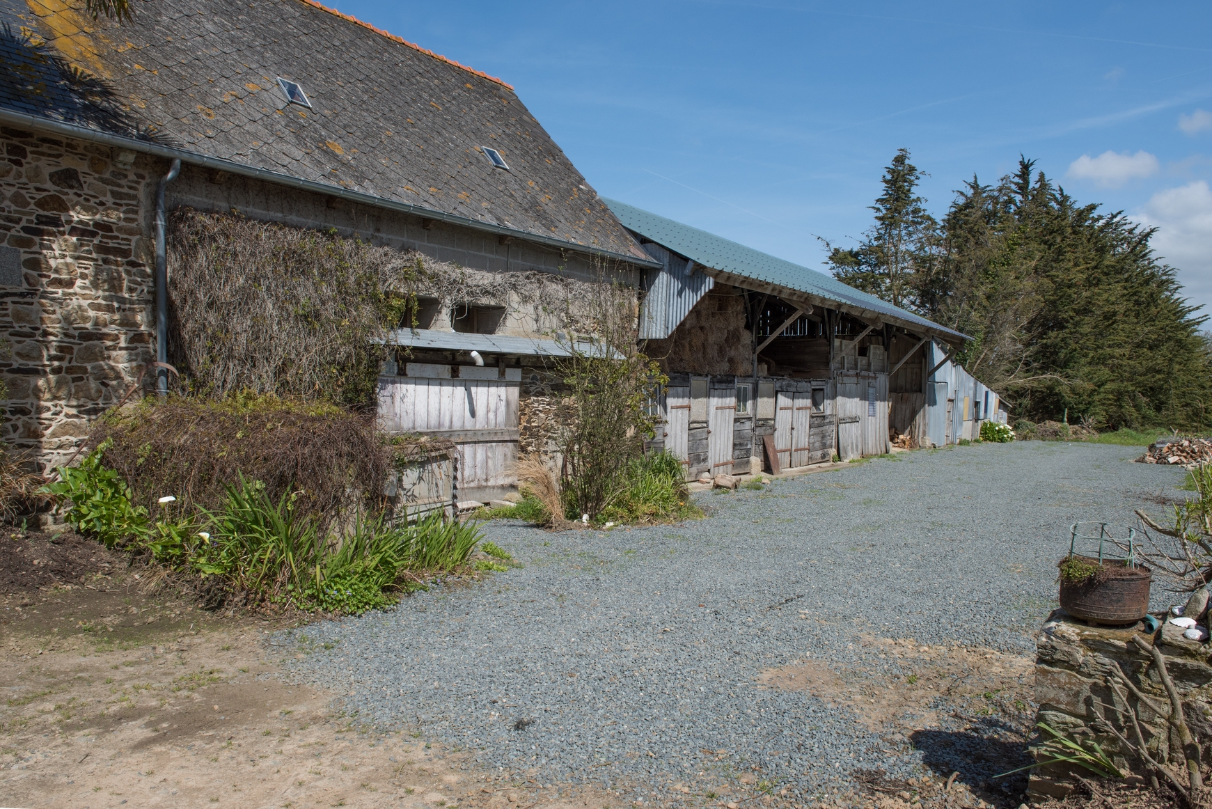 Remise, hangar et vestiges du muret de séparation entre la cour et l'aire à battre. Vue générale sud-ouestImmatriculation