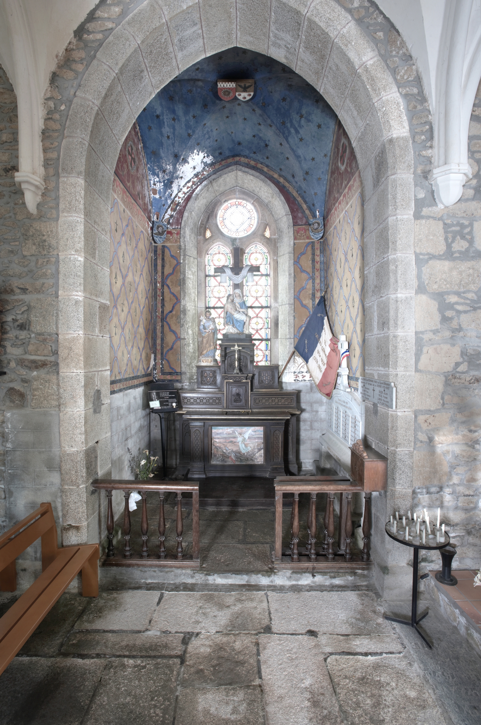 Kermaria-Sulard, le bourg : église paroissiale Notre-Dame-de-la-Joie, vue intérieure, chapelle latérale et monument aux mortsImmatriculation