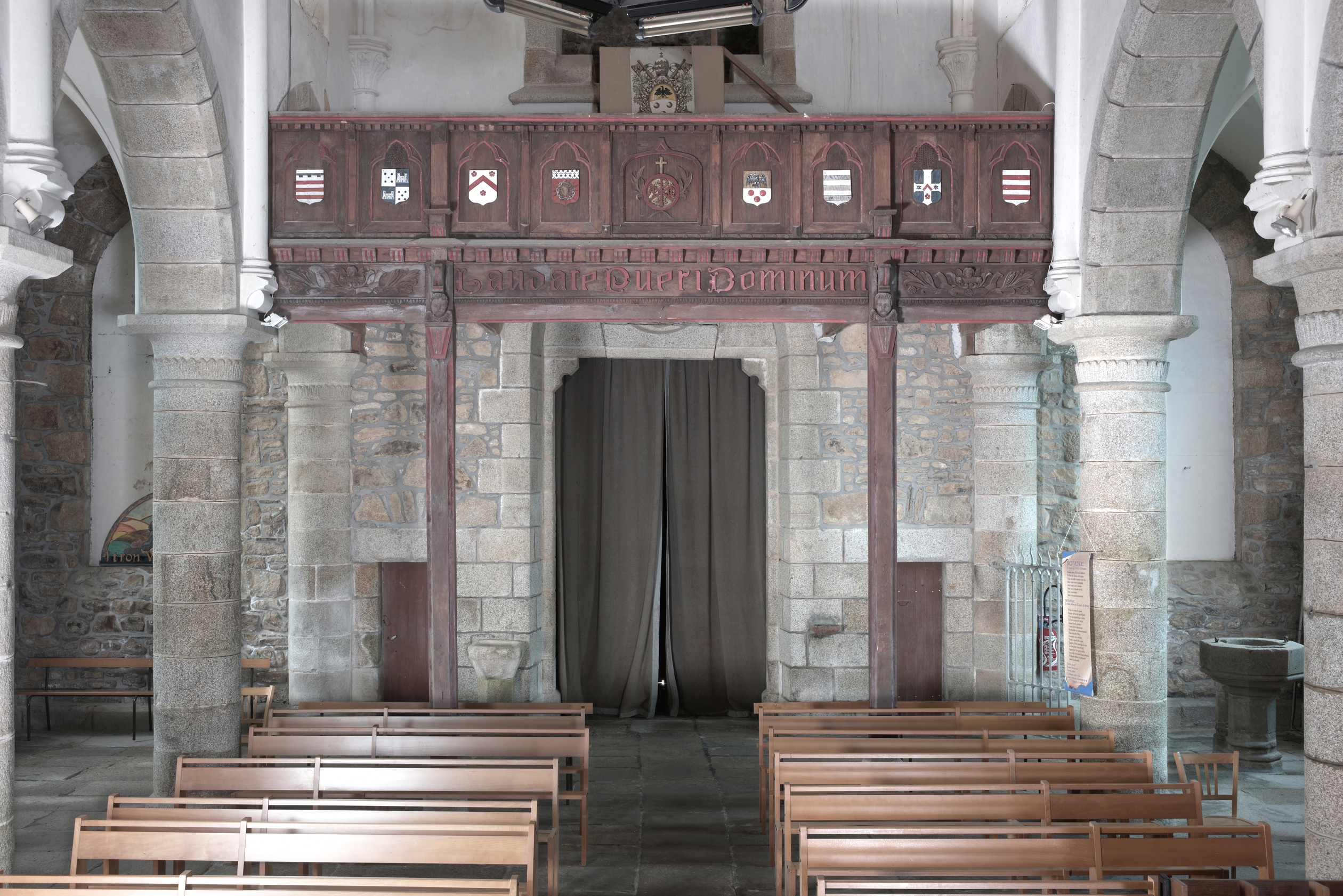 Kermaria-Sulard, le bourg : église paroissiale Notre-Dame-de-la-Joie, tribune armoriée. On peut lire l'insciption latine : "Laudate pueri Dominum"Immatriculation