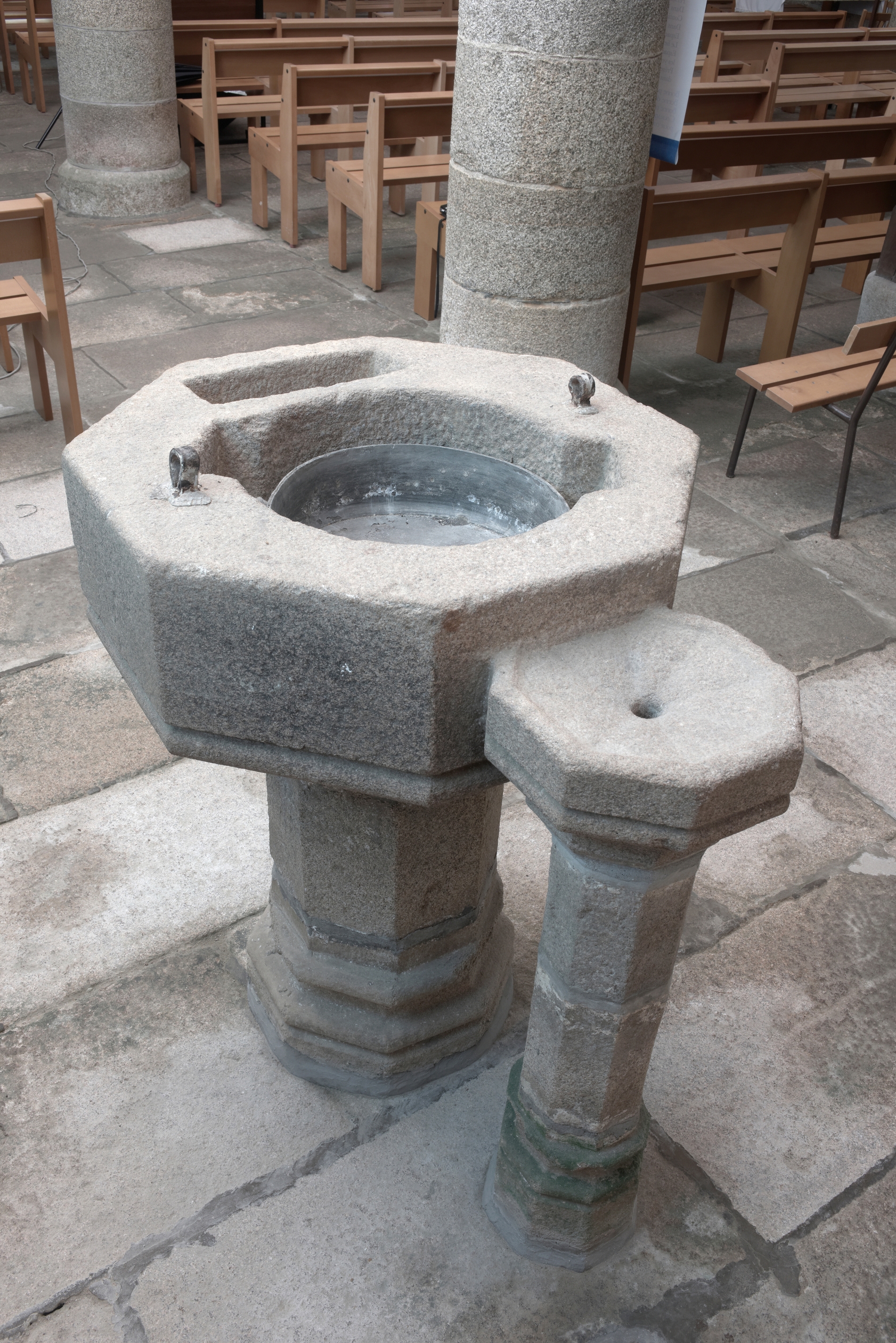 Kermaria-Sulard, le bourg : église paroissiale Notre-Dame-de-la-Joie, fonts baptismauxImmatriculation