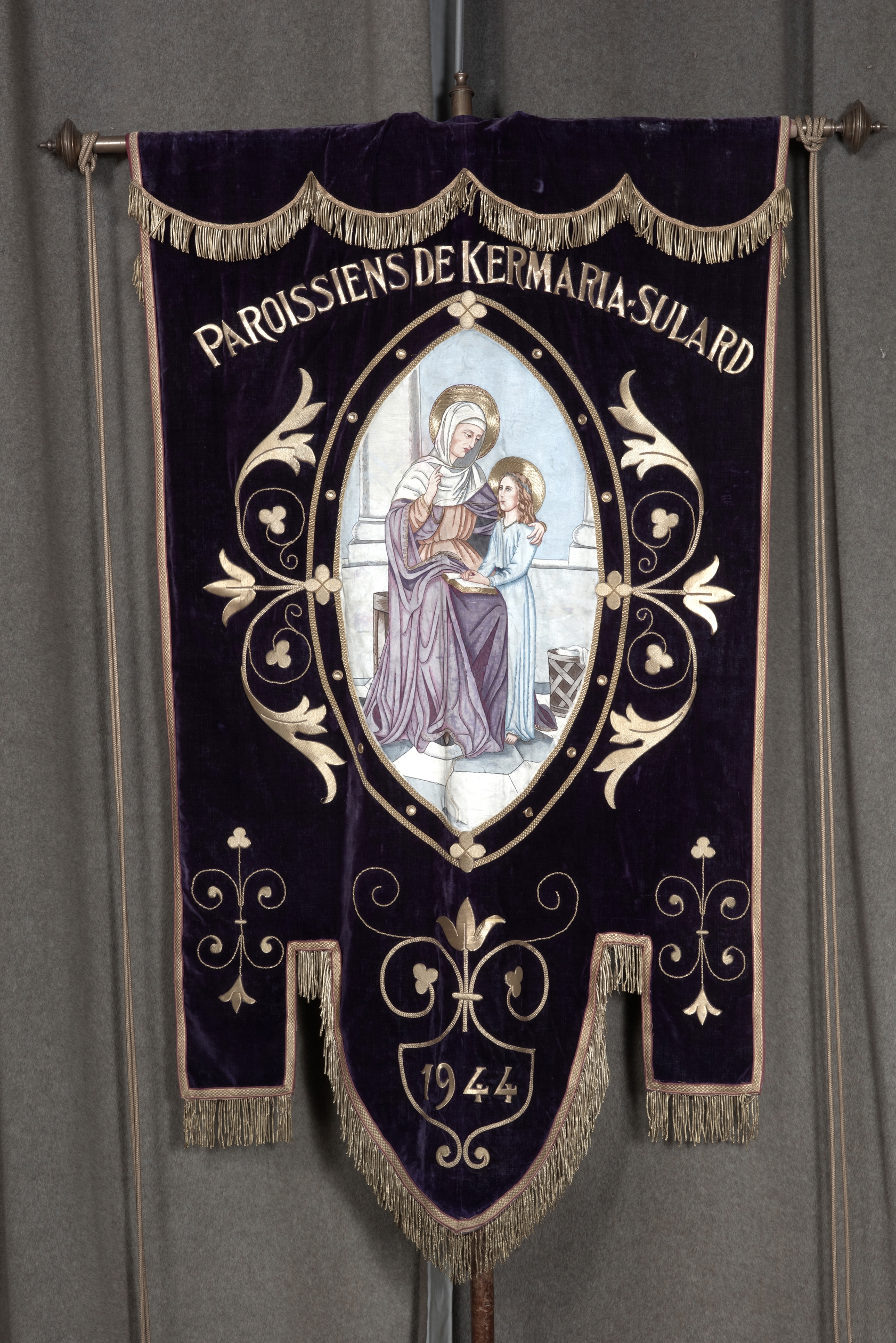 Kermaria-Sulard, le bourg : église paroissiale Notre-Dame-de-la-Joie, bannière datée 1944Immatriculation