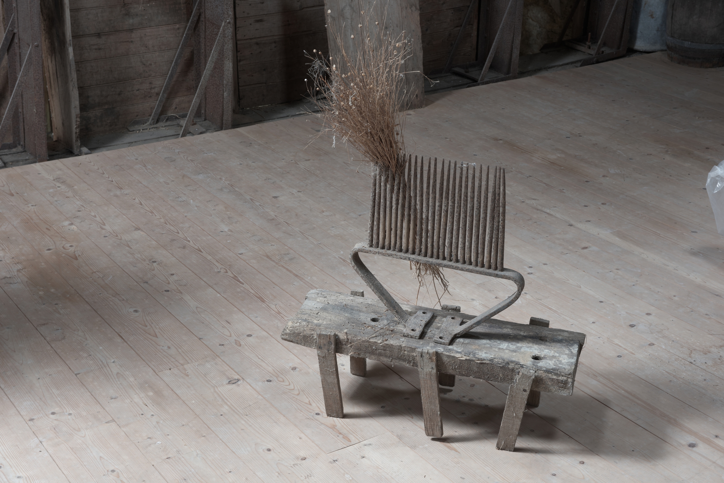 Peigne ou égrugeoir en fer forgé assujetti à un banc. Outil permettant d'égrener le linImmatriculation