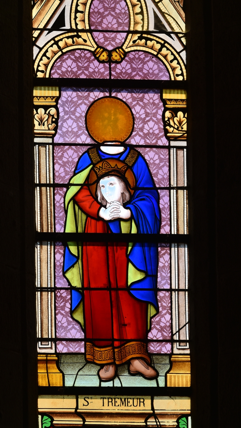 Église paroissiale Saint-Trémeur (Camlez) - Verrière. Détail de Saint-Trémeur. Lux Fournier, maître-verrier (Tours), 1929.Immatriculation