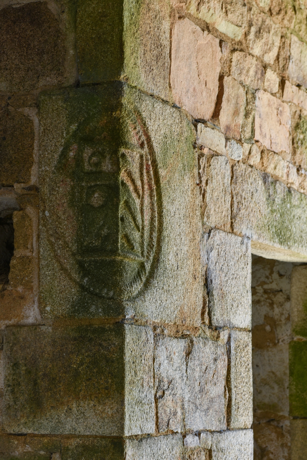 Château de Kerham (Camlez) - Camlez, Kerham : grange, détail du remploi du blason de la famille le Lay dans un pignonImmatriculation